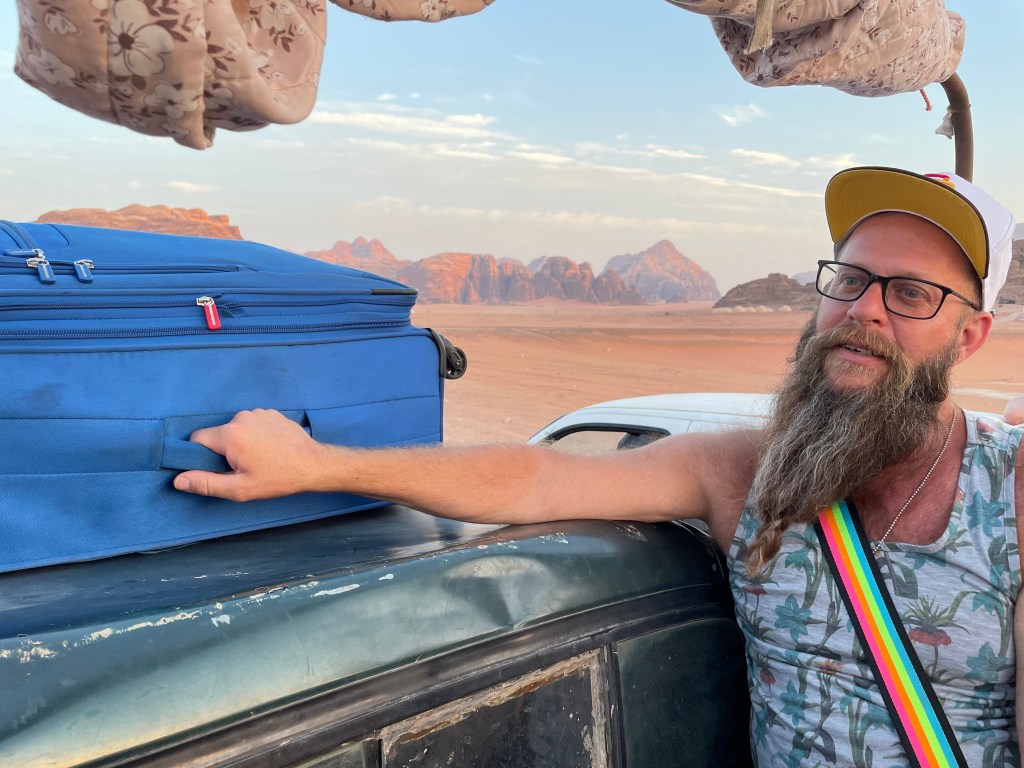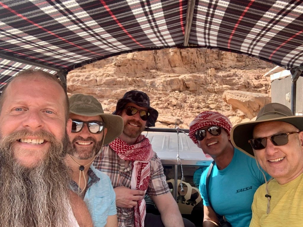 We arrived at the desert’s edge, with daylight to spare, where we would transfer to our “off road vehicles” to venture across the sand. There were no roads to be seen (unless you consider random tire tracks a road), just craggy red mountains in the distance surrounded by sloping waves of fine red sand that seemed to have no end. Our “off-roaders” were…well…let’s say not exactly the vehicle one might expect. Or capacity planned at all. They were simply beaten down old four-wheel drive Toyota pickups. Three for us to ride in the back on makeshift benches, the two quad-cab interiors saved for the luggage…which wasn’t enough room. It was comical to watch these guys figure out how to arrange and shove all the bags into the trucks, yelling at each other in Arabic, so none of us knew exactly that they were saying. At one point, they suggested Brian just hold onto his on the roof of the cab.