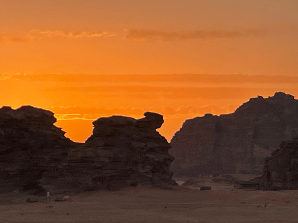While we could easily have spent more time exploring the wonders of Petra, we headed for Wadi Rum with hopes of seeing the sun set over the red desert. Many of us are lucky enough to live at a coast and see amazing sunsets over the ocean, but we were eager to see a different version… the sun slowly turning the sky shades of saffron…amber…pomegranate…as it bids goodnight to the sandstone cliffs and the hot sand.