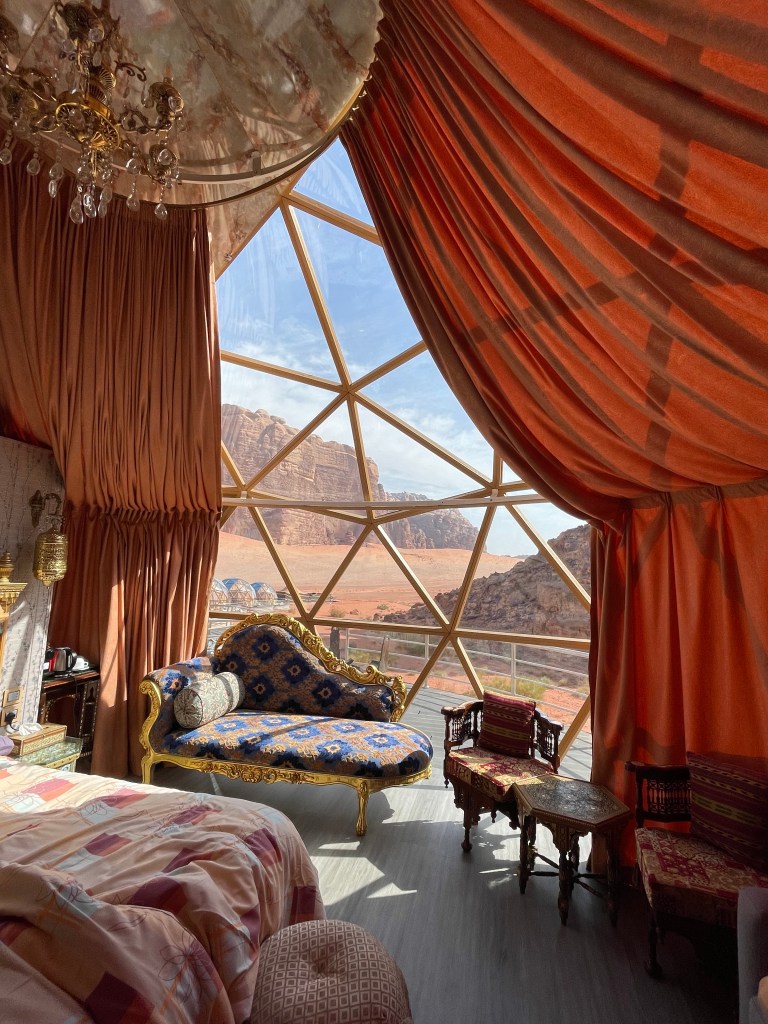 Our “rooms” were these really cool geodesic domes, outfitted with creature comforts like air conditioning and full bathrooms, and with interiors designed like a sultan’s private chambers. Or perhaps it was more like the interior of Genie’s bottle? No matter how you describe it, a unique experience for sure. We are not roughing it, by any means.
