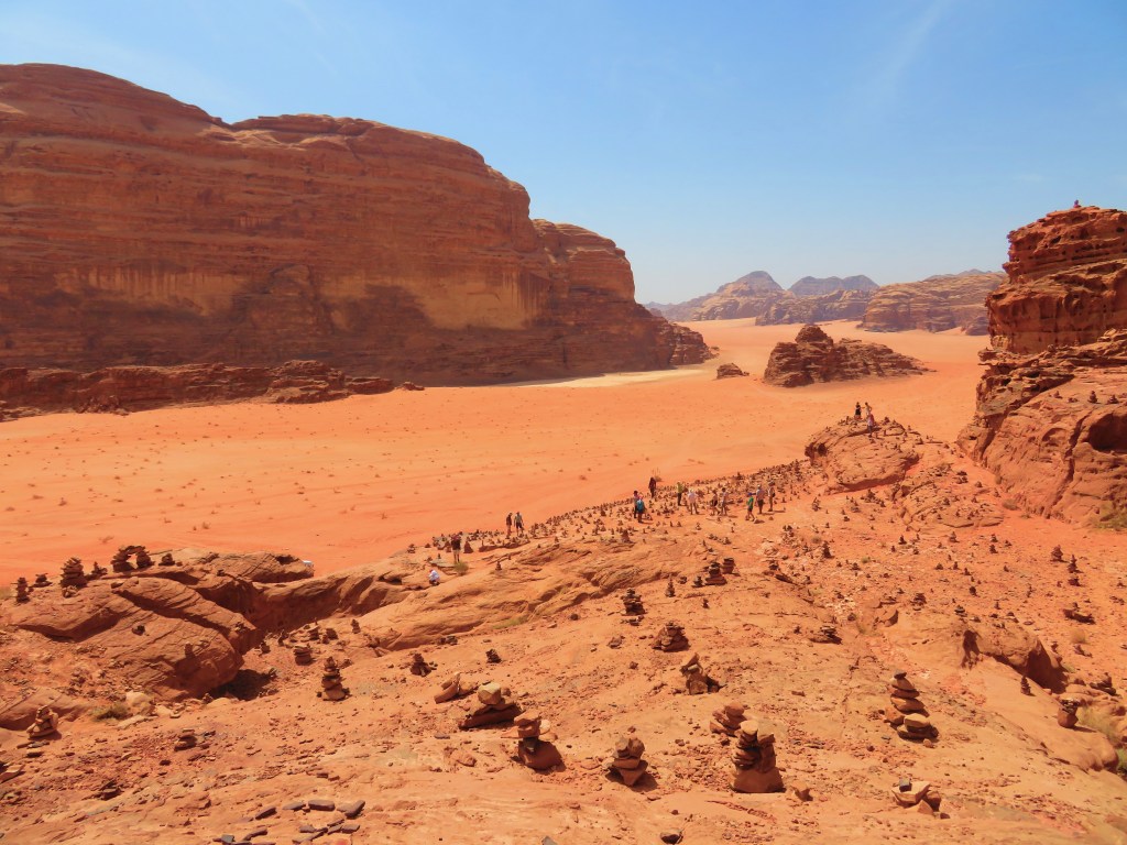 Roll the tape forward a couple thousand years…to 1917 or so…and in this desert you’ll come across Lawrence of Arabia. Not such a mystery but you can still feel there are secrets about him held by this desolate land. An understandably popular site to see is the dwelling (elaborate by desert standards) that he stayed in. The many visitors have taken to building rock sculptures…trying their hand at conquering the laws of gravity with balance. The stacked rocks are strangely intriguing, and there are so many. It made me wonder what would be said about these piles 2,000 years from now…what significance would be placed upon them? Just moments ago, did we ascribe significance to the camel carvings when maybe they were just…for fun?