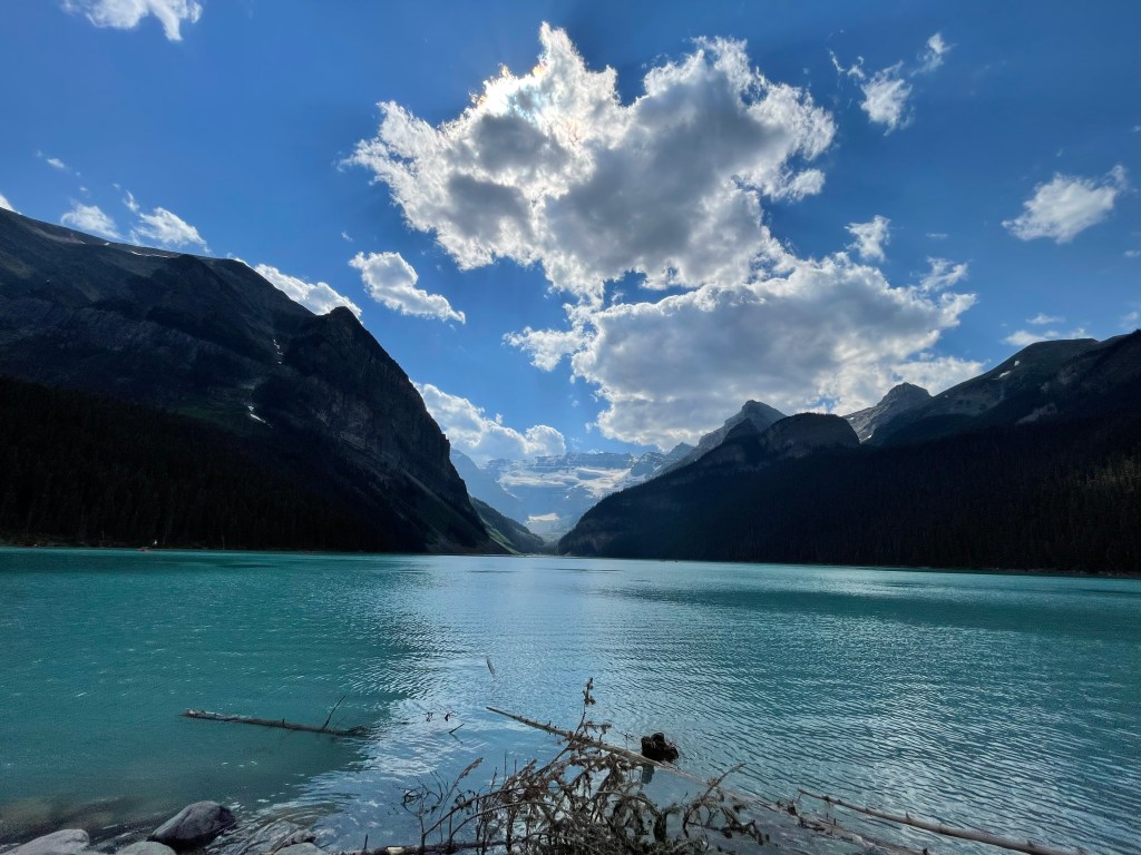 Everywhere you turn in this magical landscape it just becomes more and more beautiful. The pictures really don’t convey the feeling of being IN it. It’s vast and colorful and expands all around further than you can see…everywhere you look you have to turn a 360 to take it in. The mountains push their way up to the perfect turquoise backdrop of cotton ball clouds, the carpet of green pine trees softening the slopes’ edges that gently, sometimes forcefully, make their way to the icy cold glacier-melt rivers that cut their way through the rock and feed the lakes. It’s spectacular and timeless…