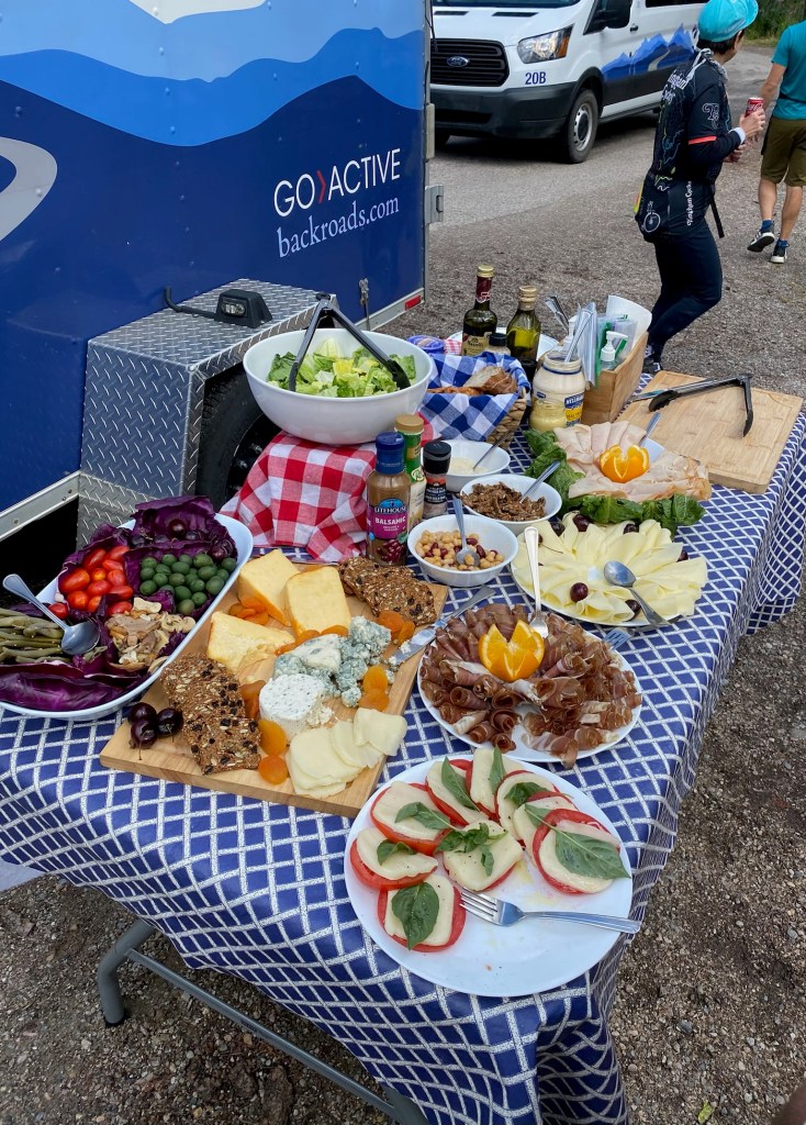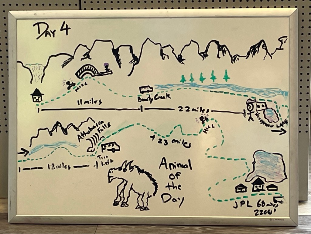 Lunch was a fantastic picnic Noah put together, enjoyed at a small campground in the middle of nowhere. The mountains above us, lonely pine trees keeping us company, dirt under our feet, a tranquil lake just down the path with a bench to sit and ponder. It was exceptional and energizing for the last push into town (and the final hill we knew was coming). The only disappointment that day was no mountain goat sightings, in spite of David’s excellent rendering… 😄