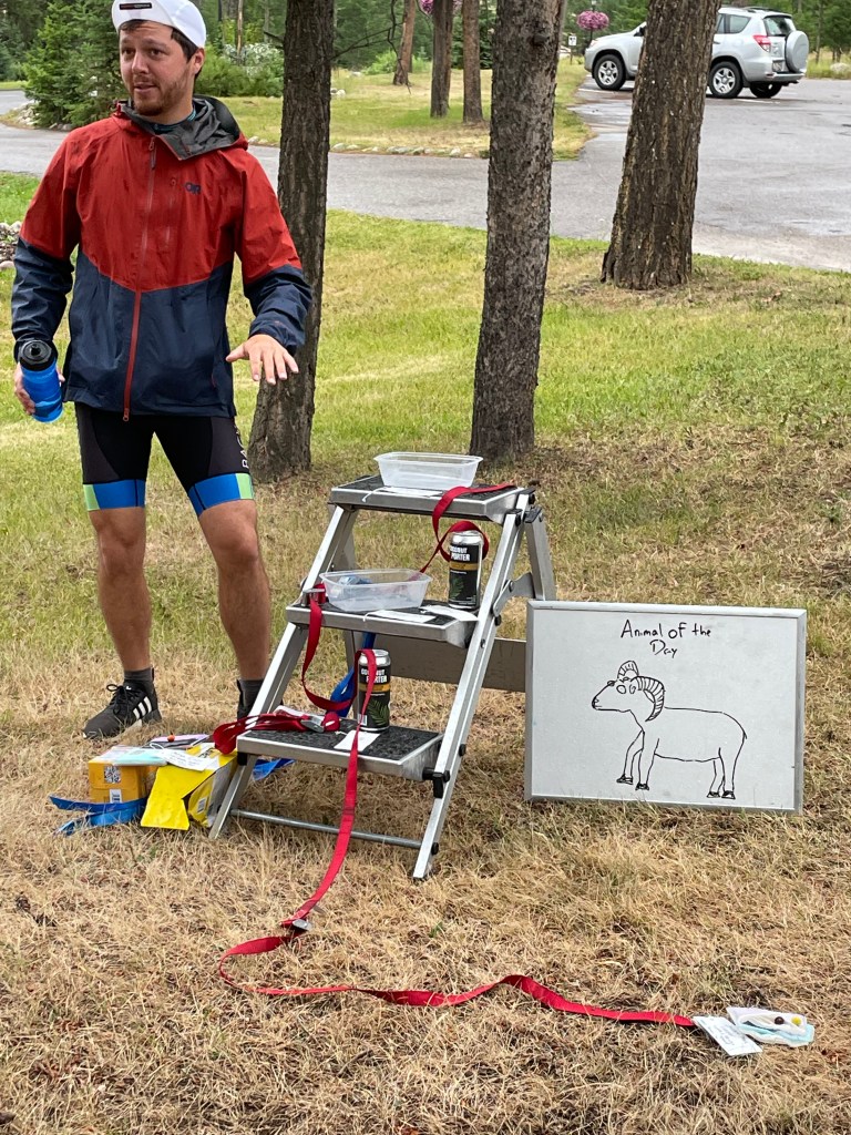 The next morning was…wet. Or was that the sprinklers? Hmmm…not sure I’m up for this. At the route rap, I got inspired – just a bit. Noah described the hill [step stool] upon which sits Lake Maligne [plastic box with water in it]…if you start at the bottom, a 25 mile climb up (!), then a descent with a one-can climb, down to Medicine Lake (which drains through mysterious subterranean rivers but that’s another story), another descent and a one-can climb, and an optional hike across bridges [cookie boxes]. You can’t help but get inspired! Okay then, even though it is likely to rain, we decided to go for it – but the short option (shuttle to top and ride down).