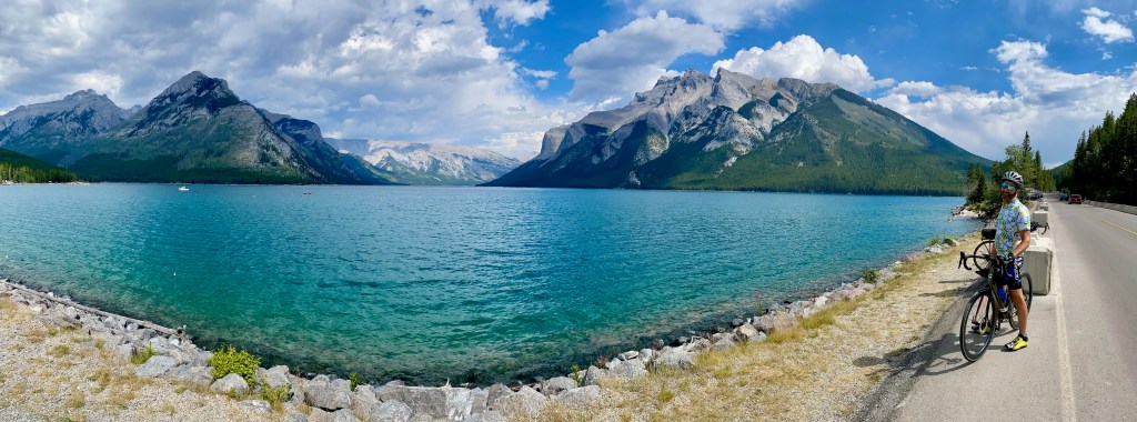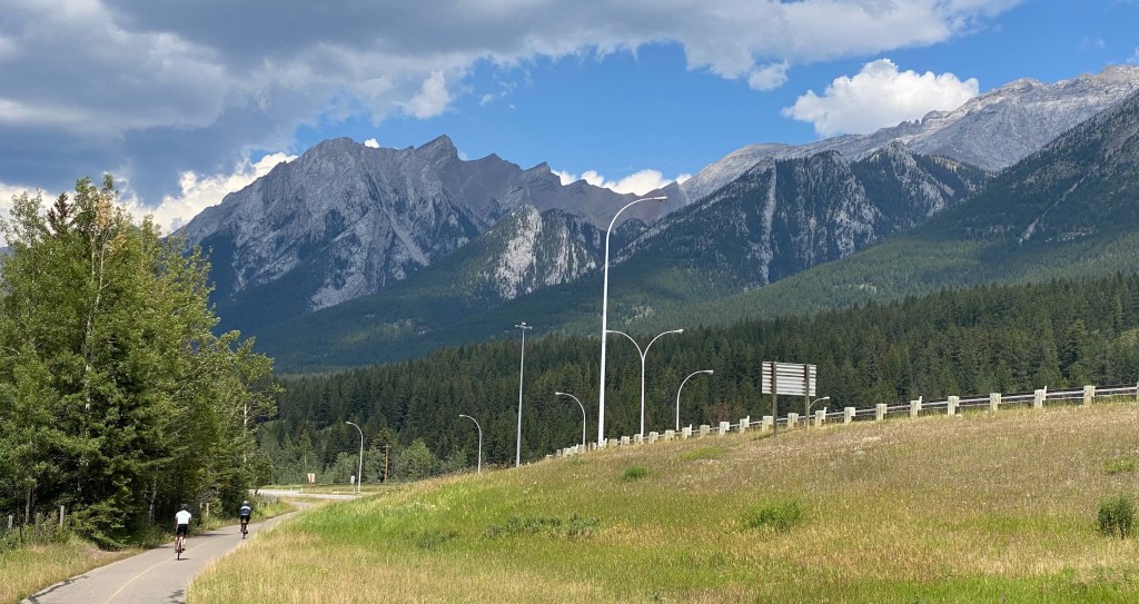 It’s hard to say but keeping it real – in hindsight, this was my least favorite ride. Even though there was a wide shoulder most of the way, we rode on the Bow Valley Parkway and it is essentially a freeway. Cars passing each other, big tractor trailer trucks, RV’s, beefy pick-up trucks towing massive fifth wheels…the sound of engines and tires on roads and the wind whipping past with each one was just unsettling and kept us from really enjoying the surrounding majesty of mountains and sky.