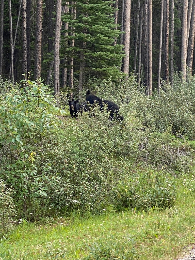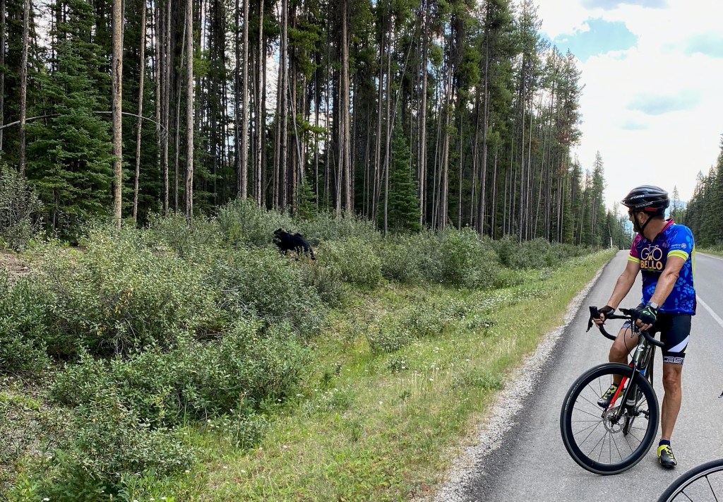 One of the safety briefing topics was to watch for “bear jams”: a vehicle stops when they see a bear, and another joins them, and all of a sudden a dozen cars are scattered across the road. None of these people are watching for cyclists so beware sudden moves and car doors opening! We got lucky with our first bear sighting – nary a car to be seen.