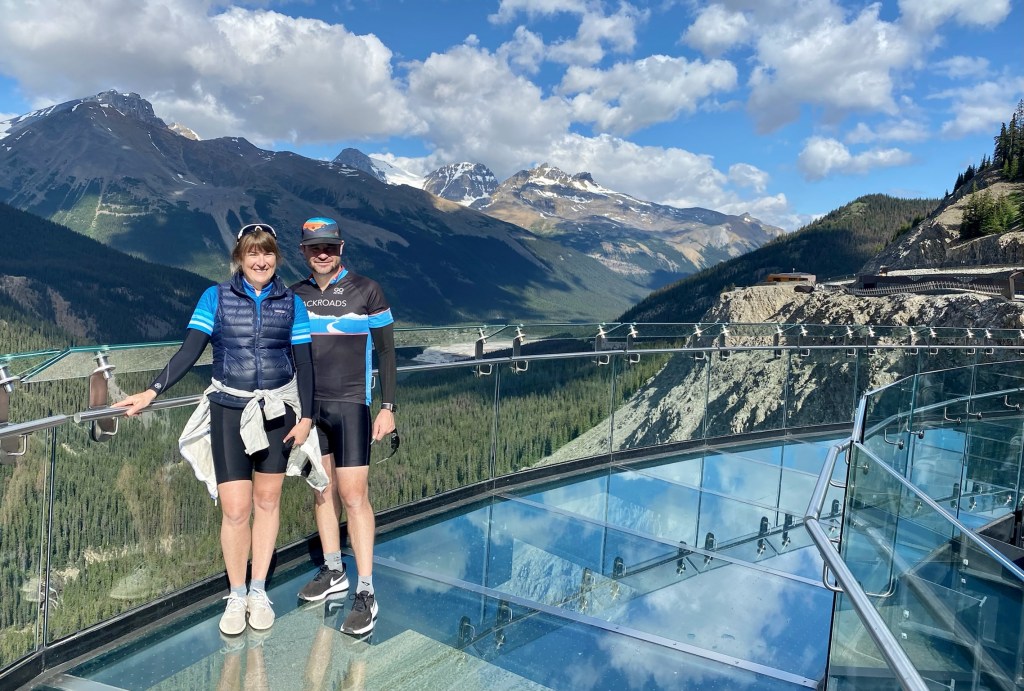 A long day of riding was planned but not too much climbing. This was by far my favorite day – amazing cycling, very little traffic, a couple stops to see cool stuff (the Glacier Skywalk and the Athabasca Falls), and getting off the busy trafficked road. The weather kept changing, as did my outfits (had to throw that in Nic!). We started cold and ended warm, descending 3,000′ by the time we got to Jasper.