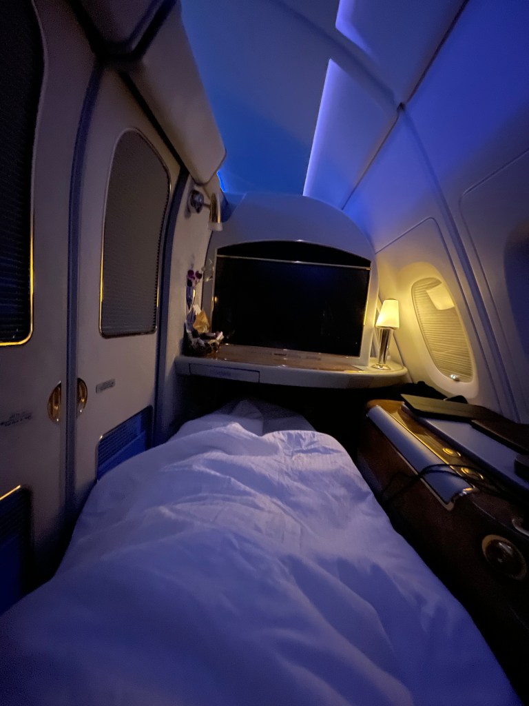 Not only did we board the plane directly from the lounge (god forbid you should have to go back into the airport chaos of information monitors and lines of people), we were personally escorted to our suites that, yes, have doors for privacy. Champagne and caviar and pretty much whatever you’d like to eat or drink, whenever you want. We settled in, made friends with the flight attendants, and after getting to altitude, went to the onboard lounge where a bartender is making cocktails. As if all this luxury isn’t enough, there is a “shower spa” that is larger than many apartment bathrooms! Indeed, I took a shower at 39,000 feet before landing in Dubai. A once-in-a-lifetime flying experience.