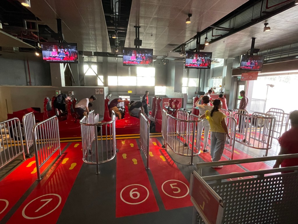 Auto racing is a big thing here, and thus they have Ferrari World. Essentially an indoor amusement park complete with three different roller coasters and Ferraris to drive, it is, of course, attached to a giant mall. We agreed on a few hours to explore the place, first finding our way to the fastest roller coaster on the planet. Lunch would definitely be after the roller coaster! Our timing was great, as the lines were short, and we were soon whisked – no, thrown – to top speed of 145 miles an hour, plastic goggles protecting our eyes from the wind and hands clinging to the restraint surrounding our waists. Bobb and I were both a little wobbly afterwards, my frizzy blown hair and frayed eyebrows evidence of what we had just gone through. We needed to sit down…