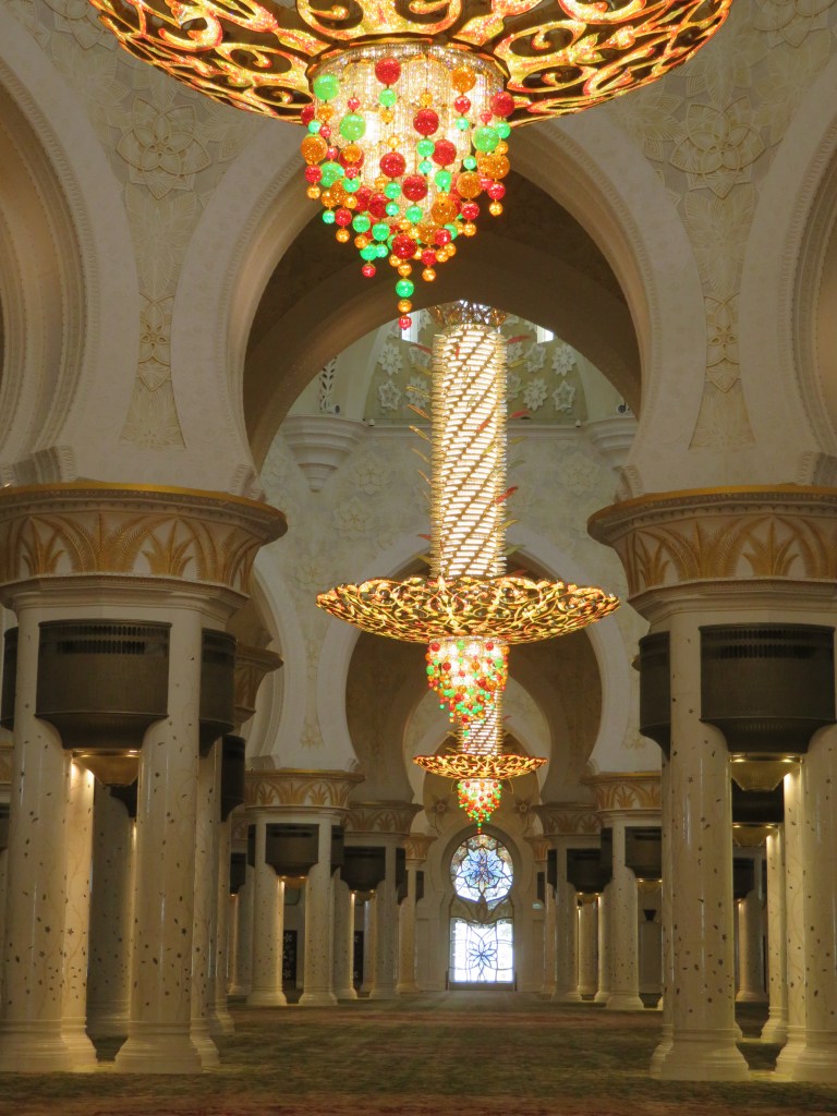 It was absolutely wondrous…white marble, gold,, gleaming, finely inlaid with intricate stone flowers, and spiritual at the same time it is earthly. The whole complex is on a scale that pictures don’t capture: 100,000 people can pray here at the same time. 83 domes…8- and 12-ton crystal chandeliers…the largest single-weave of carpet in the world that 1,200 people spent two years hand-tying. The building and the grounds took ten years to complete. It is pure and peaceful, and a reminder of the tenets of Islam that are so far from the terrorist story told by the media. The long hallway from the parking to the mosque is adorned with words like compassion, community, tolerance, responsibility, volunteering, flowers, lovingness, and more. It is moments like this in a house of worship that we are reminded religion itself is not to be feared, it is a minority’s interpretation and zealotry – amongst all religions – that cause so much strife around the world.