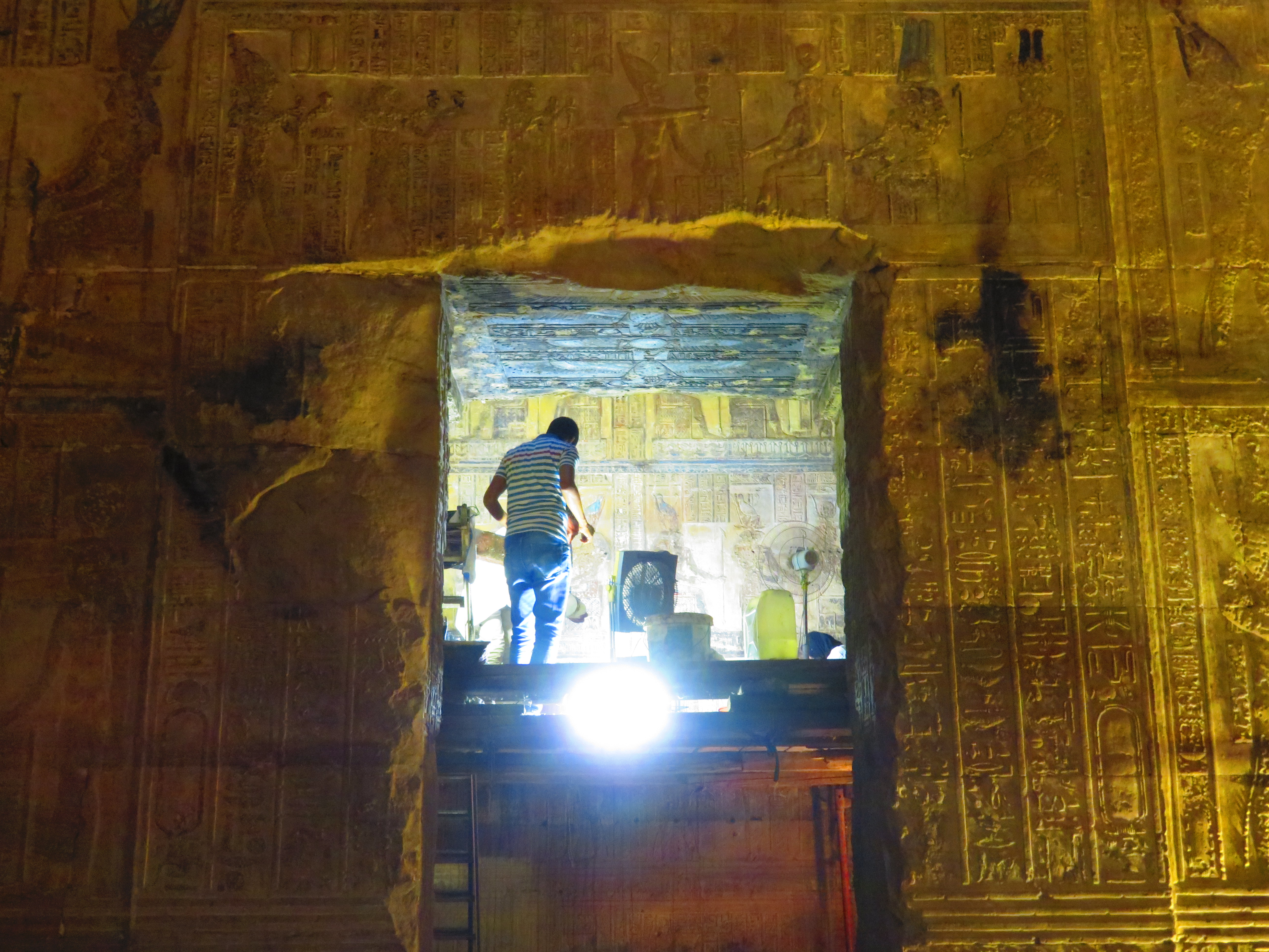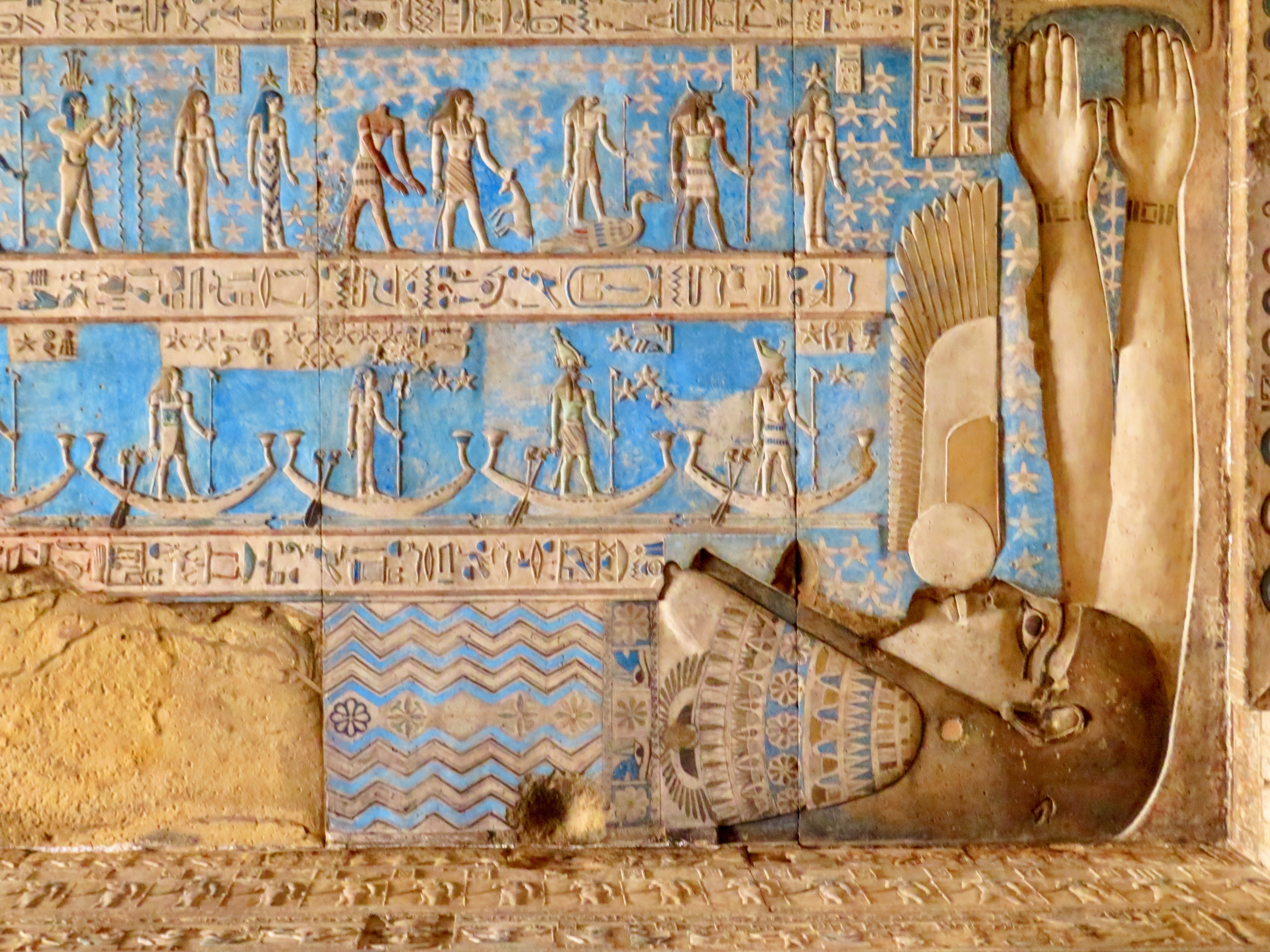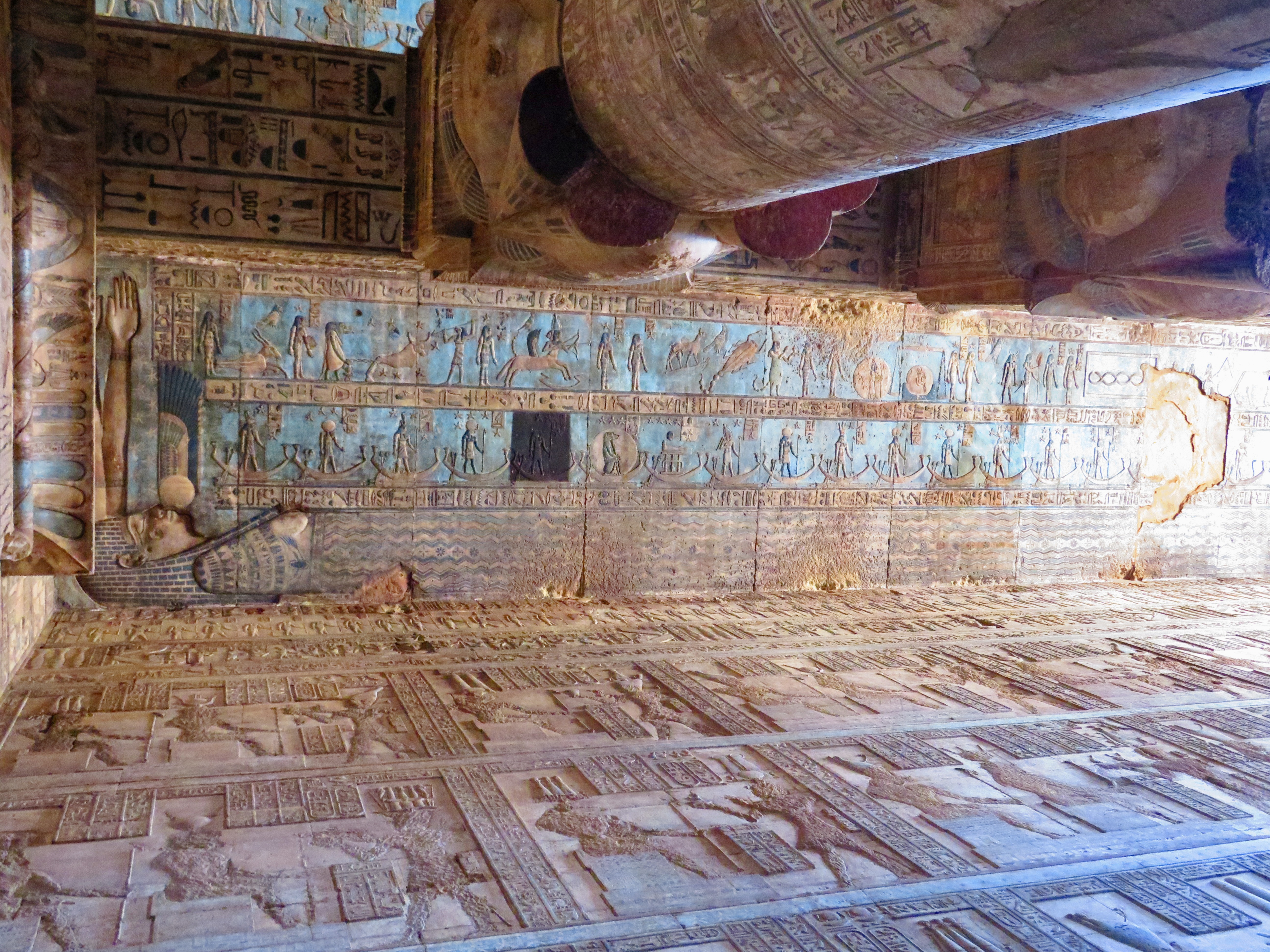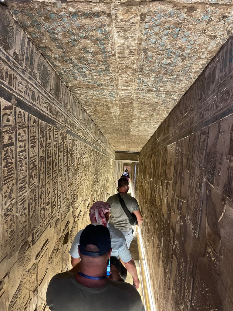 As Ahmed guides us throughout, he takes us to the roof via a series of stairways and tunnels, of course carved on every square inch. You’d think temple fatigue would have fully set in, but it just never ceases to amaze. We emerge from the stairs onto the roof, where it’s unusual to be, most of them long ago crumbled to the ground from earthquakes, pillaging, and erosion. Ducking to enter a small chapel up here, we find the famous Dendera Zodiac on the ceiling, believed to be the basis for later astronomy systems, although dating it has never been agreed upon – 2500 BC? 300 AD? And then – it turns out what we are looking at is a copy. The original is in the Louvre (and the French ain’t givin’ it back 😊).