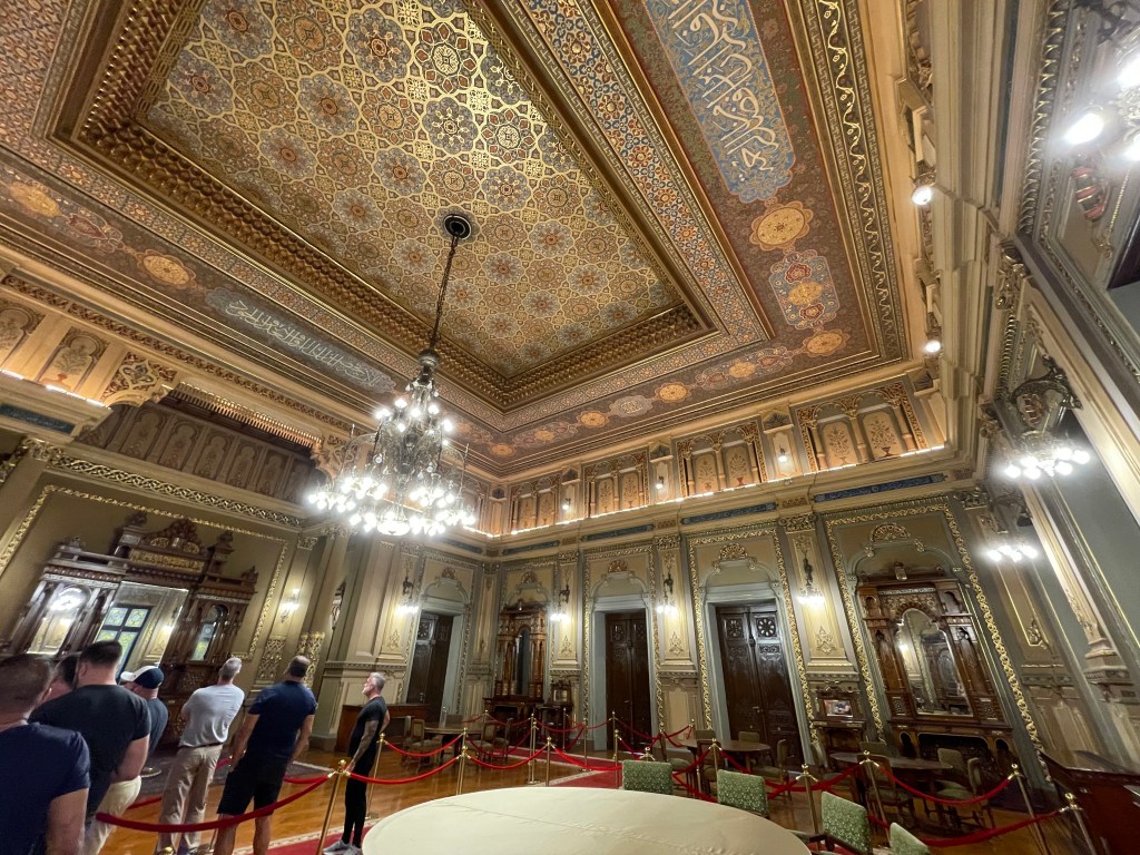 The next morning’s travel passes quickly through the fog of sleep-deprived travelers awakened too early, and we are soon piling onto the busses at the Cairo airport. We visit the Abdeen Palace (the royal family home until 1952), which is stunning, and have lunch in one of the many dining halls. It’s impressive and interesting, but still feels like we’re just killing time. Everyone declines the planned visit to Coptic Cairo and a church. We can drive by the synagogue but it’s closed for renovations so we can’t go in. I ask about Jews in Egypt and learn there are three. Yes, just three. A rather large population was vilified, persecuted, and driven out in the 1950’s and 60’s.