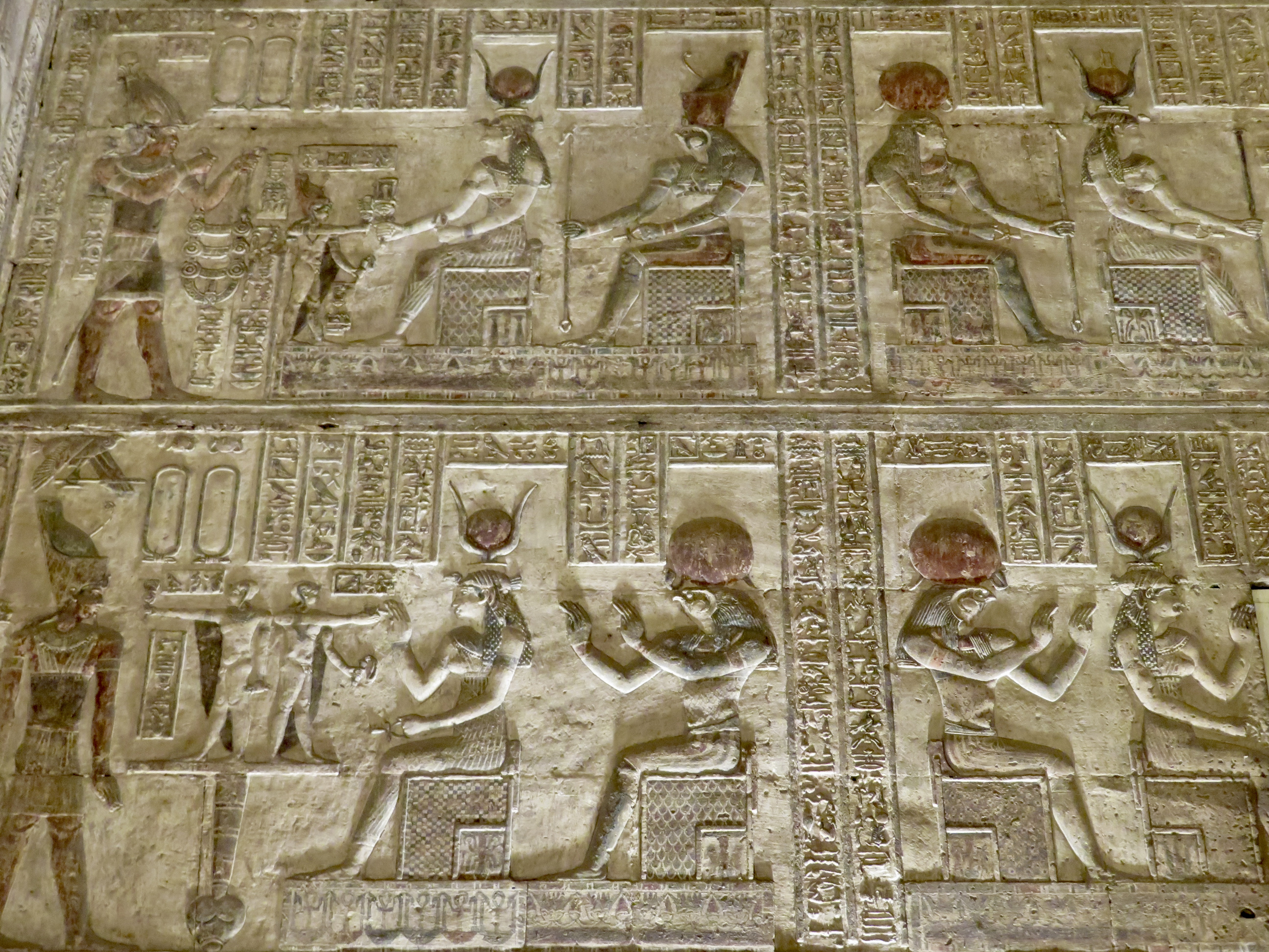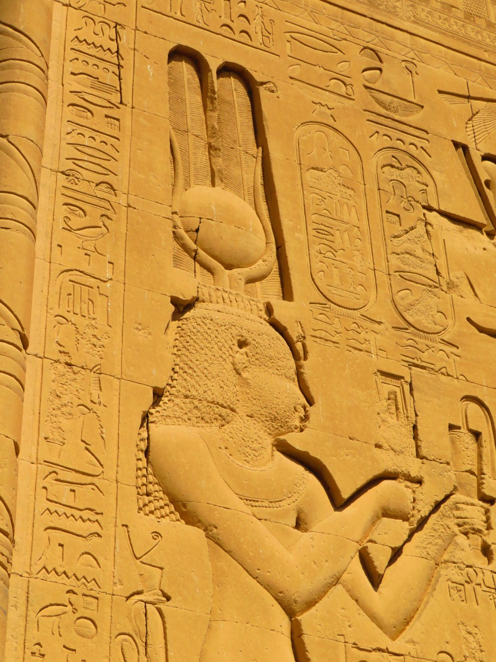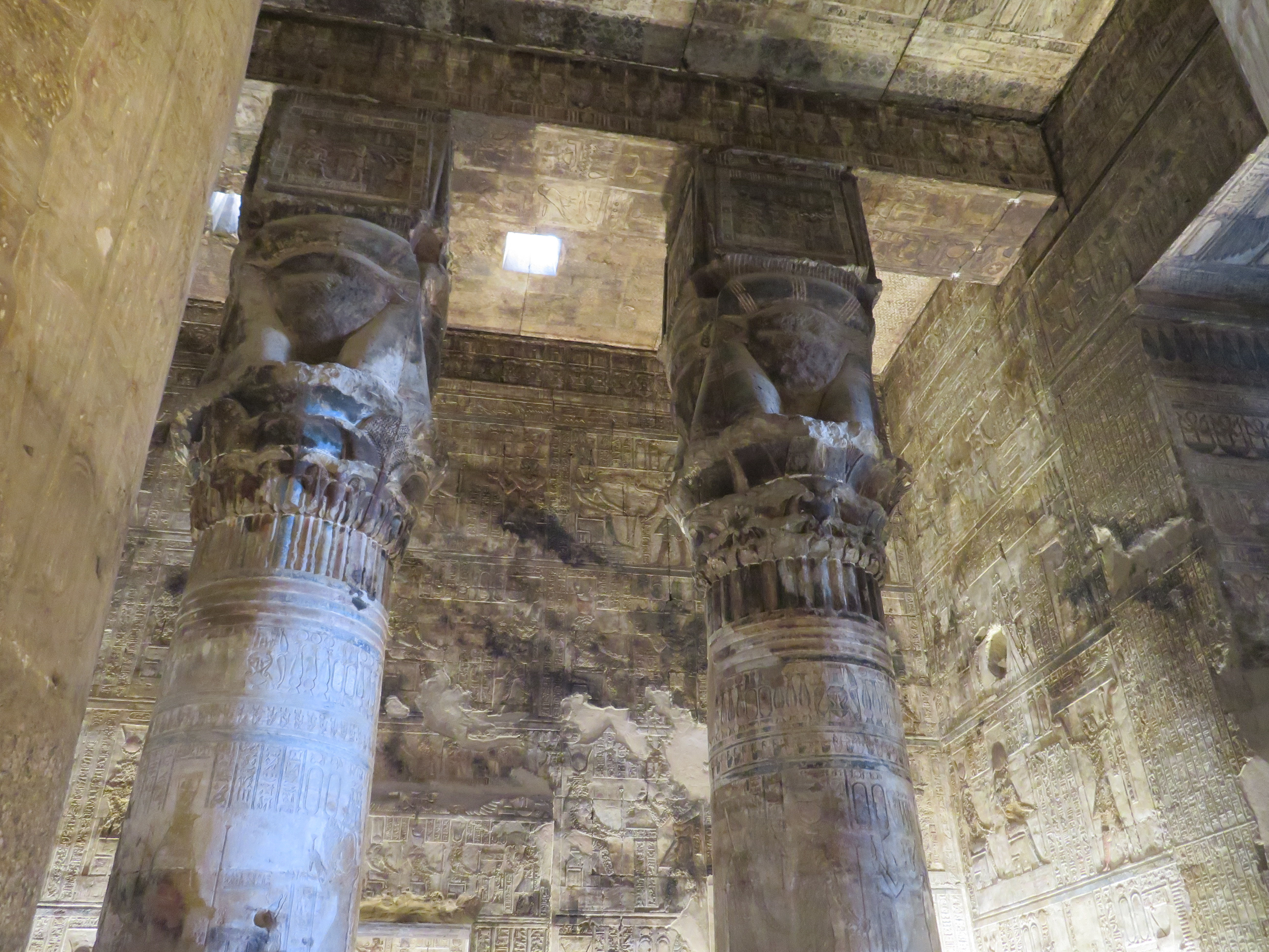While evidence exists of a temple dating to 1500 BC, what’s here today only dates back to about 350 BC (funny how 2,400 years old becomes “only” so old…). Hathor was the mother of Horus (the falcon god) and the sun god Ra, and thus represented motherhood as well as music, dance, joy, love and sexuality. She could travel between worlds and helped the dead transition to the afterlife. Her temple does great justice to her importance. It is – spectacular. The colors, the hieroglyphs, the scale of the pillars, the weight of the stones, the omnipresent visage of Hathor mothering over us earthly beings…