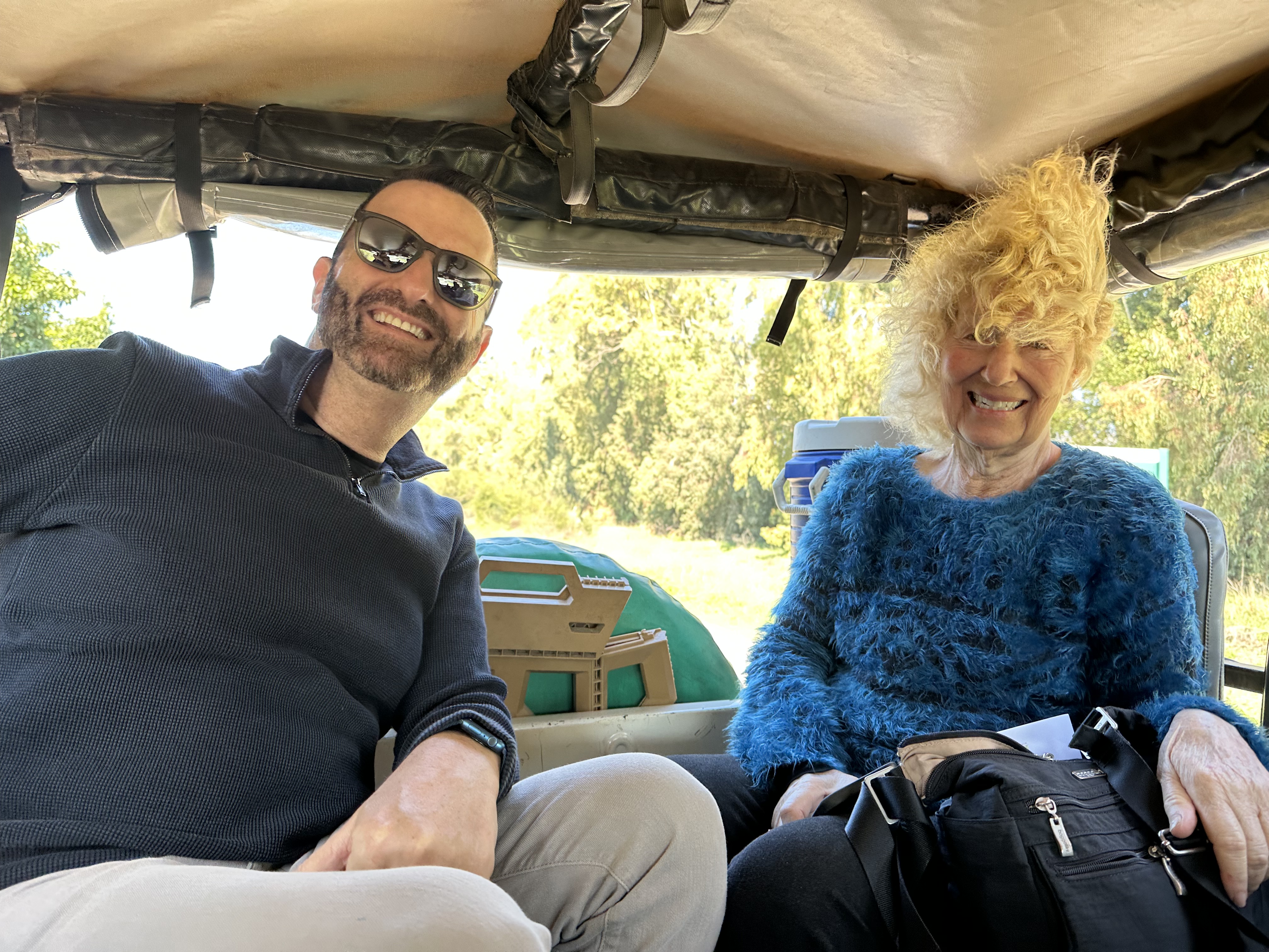 Royi turns out to be quite the host as we stop to take in the view. He makes hot tea out of lemongrass, ginger, and sage that he shoves into a pot precariously perched atop a burner on the hood of the jeep (it was delicious!) and treats us to pomegranate and pomelit. Janell has a new favorite fruit and Soli a new hat – the pomelit. 😄