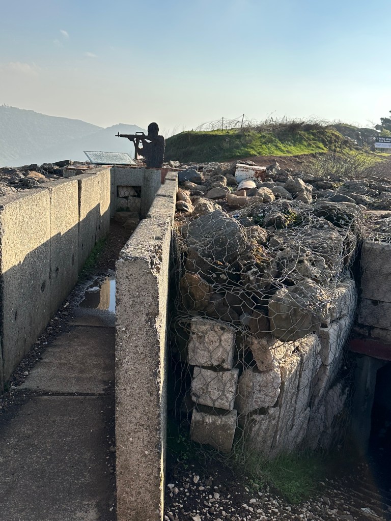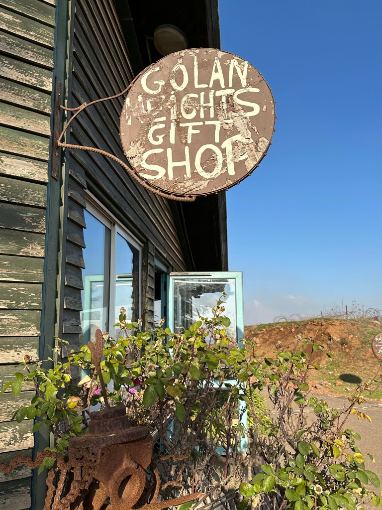 There are old bunkers across the hilltop, and artists have created silhouettes of soldiers, stationed at their posts, perhaps actively fighting off Syrian aggression – or is it advancing Israeli aggression? Two sides to every story, as they say. It’s cold and windy up here so we go inside the Golan Heights Coffee Shop (it is a tourist spot, after all) for a hot drink and continuation of the stories whose evidence is all around us.