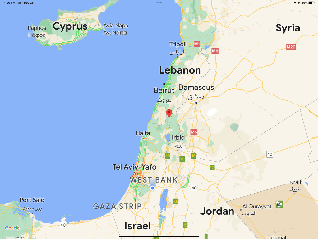 We left the Rosh Hanrika Grottos as nightfall approached, a 90 minute drive ahead of us. We are going east, hugging the northern border of Israel…and the group has grown quiet, eyes heavy and limbs weary from a long day of exploration. We pass the time silently, coming back to life as we pull into the kibbutz hotel of Hagoshrim. It is the Chanukah holiday, and apparently game night for all the families vacationing here. The lobby is jammed with parents and kids, giggling and scolding and competing on the floor and tables and over every possible surface. It is quite the scene! Dinner at the hotel buffet and we retire for the night…