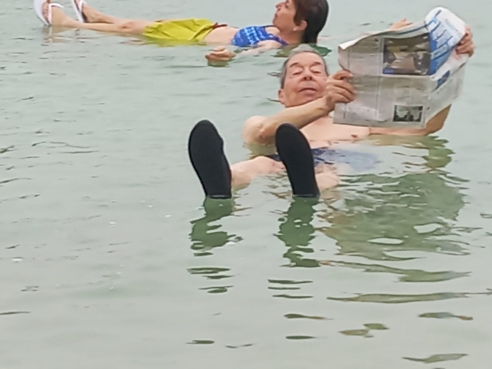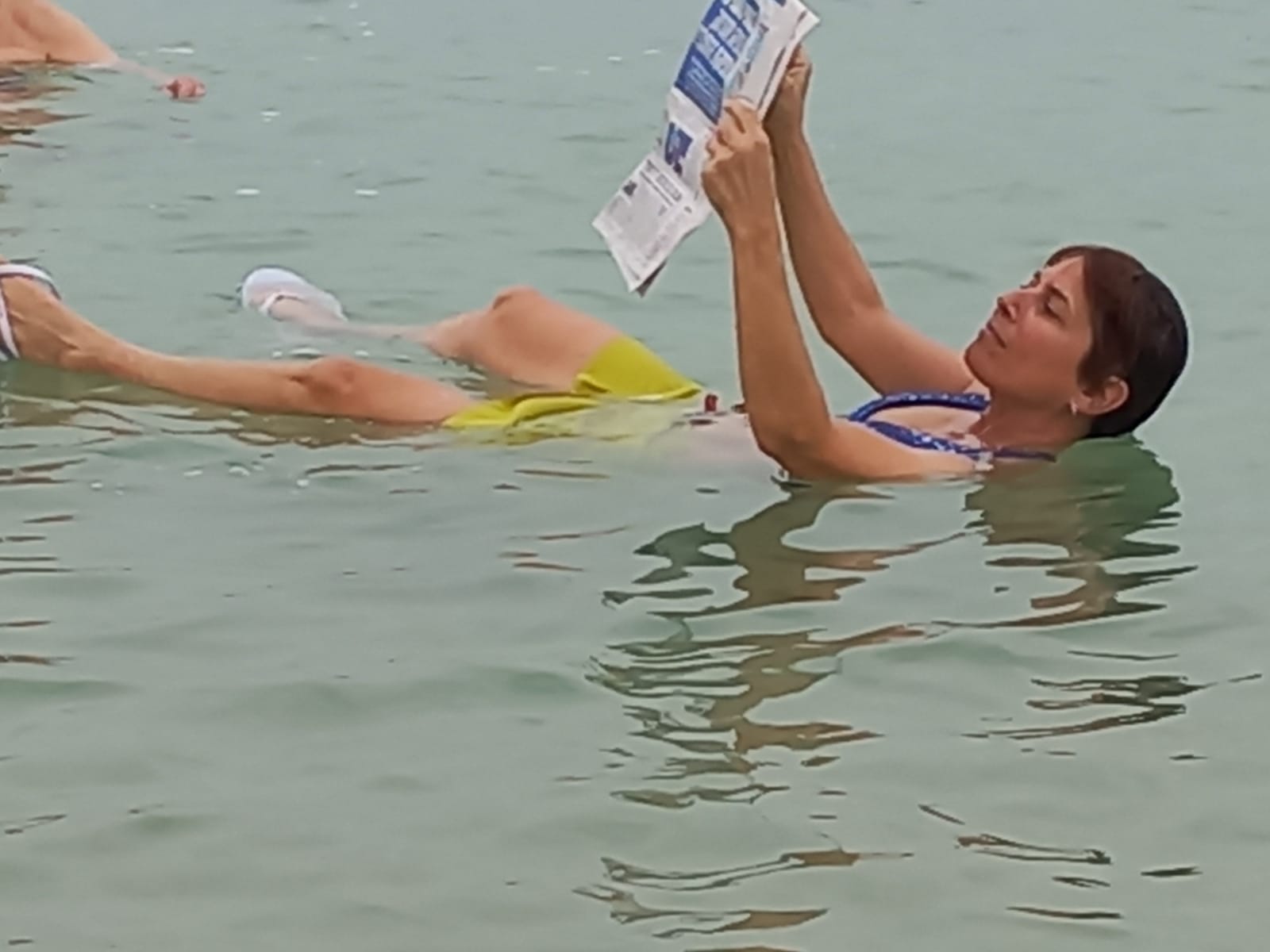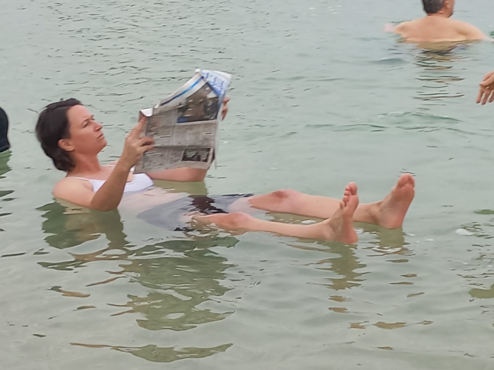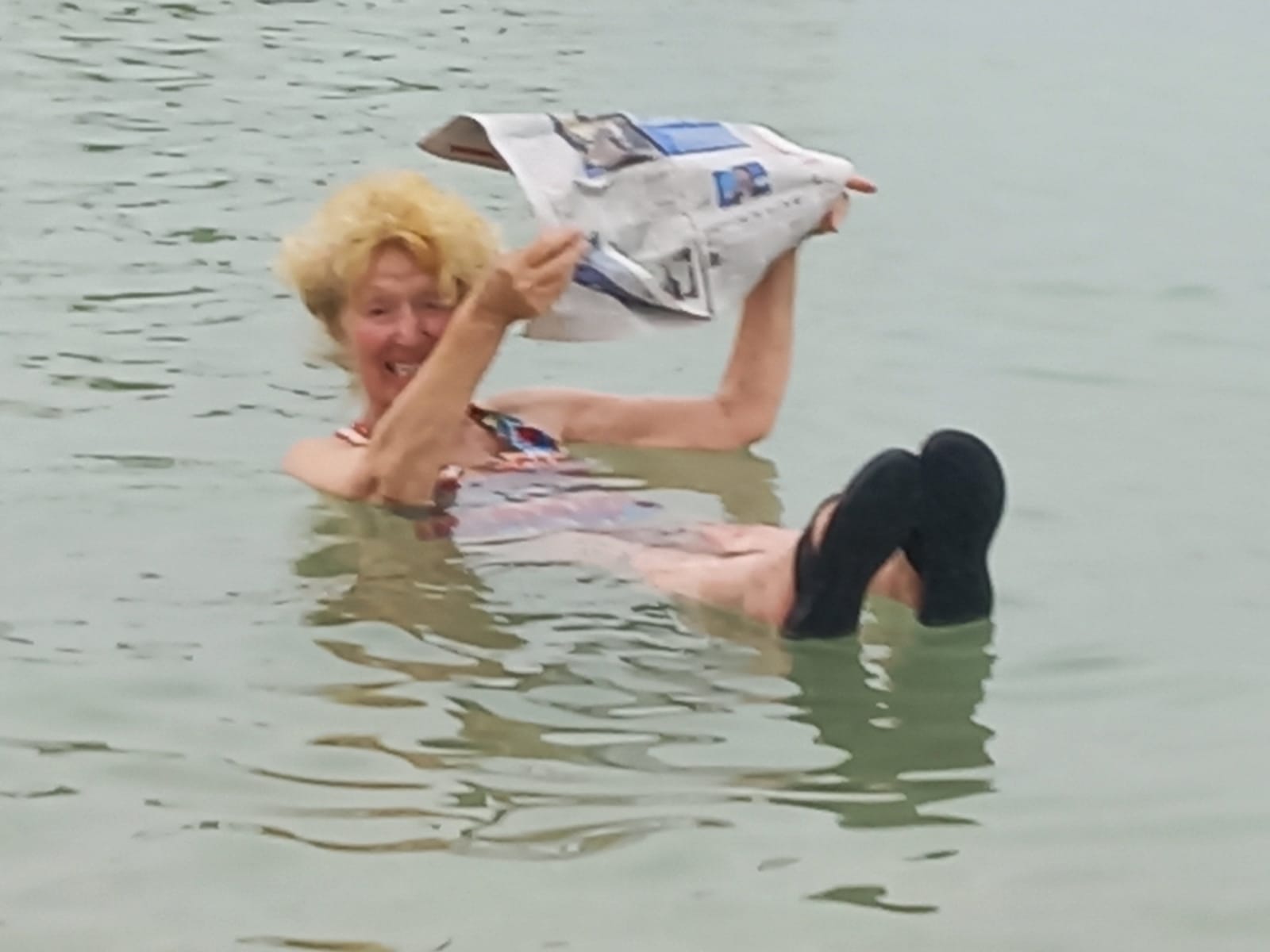 Let’s go! Hilik has made lunch – and beach – reservations for us at a hotel/spa just across the road from this calm, cloudy, and salty expanse, and we are chattering with excitement as we get closer. We plow through our meal, change into swimsuits and robes, and head for the water.