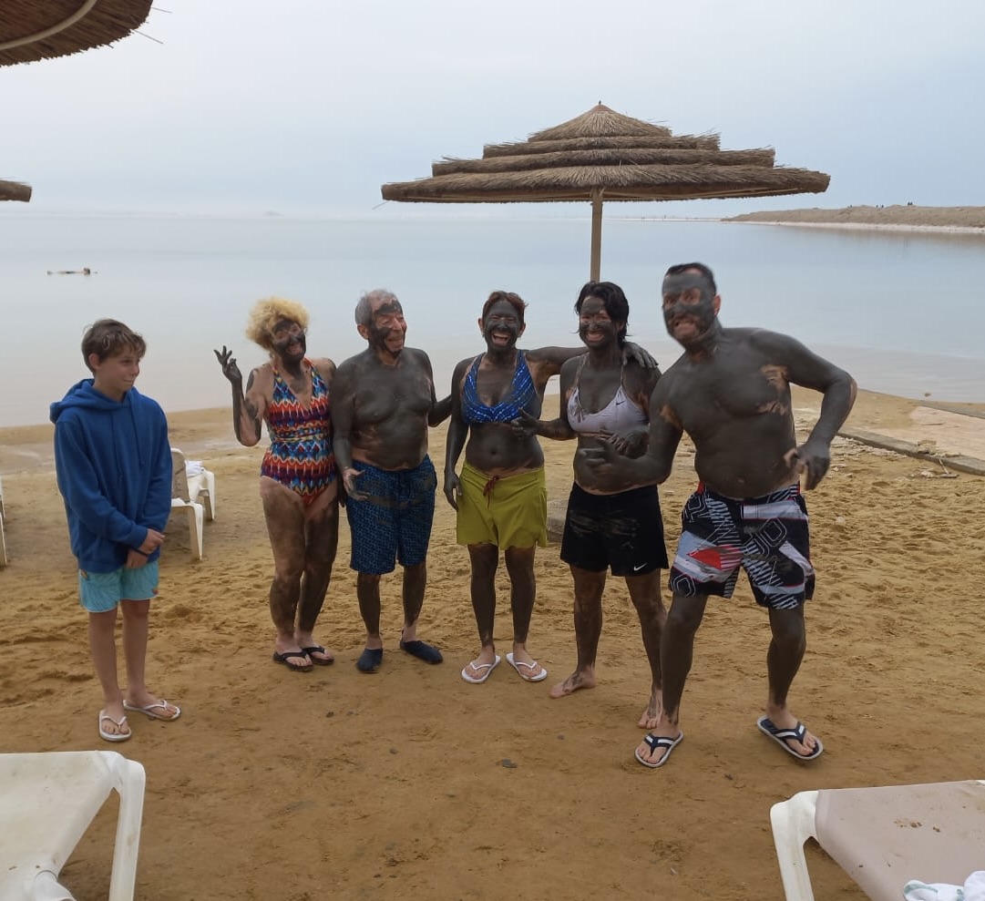 The mud is left to dry a bit, and we shower it off at the beach, another activity that requires mutual aid. Our whole bodies – backs, arms, legs, faces – that were for a moment a steely gray with the sea’s healing dredge – are now clean like never before and “soft as a baby tushy.” As we dry off, there’s a calmness of mind and body provided by the water, the air, the wet earth. We head back to the spa for some chill time, relishing the amazing Dead Sea experience we just had. It is healing both physically and mentally in a way that is hard to describe. “Purifying” maybe?