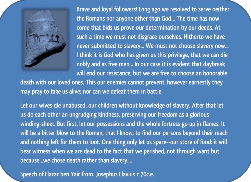 Many years pass (including Herod in 4 BCE), and shortly after the destruction of the Second Temple in Jerusalem (70 AD), Jewish rebels stormed the palace and took control of it. They miraculously held off the Romans for three years, and when it became clear the Romans would finally re-take Masada, the Jewish rebels killed their own families and then themselves. It was a mass suicide of nearly 1,000 people. Artifacts attest to who it was – their names were discovered on shards of pottery – the last holdouts who chose death over slavery. Take a moment to read the whole speech.