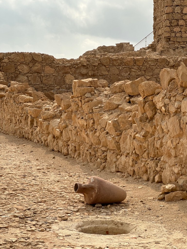 The Northern Palace, perched at the tip of the plateau, had three levels stepping down the hillside attached by exterior staircases. It is architecturally stunning and just massive (there’s a model in the pics above). Looking out over the Dead Sea, the Moab Mountains, and the oasis of Ein Gedi in the distance, words escape us as we stand at its edge…but we now understand “why here.”