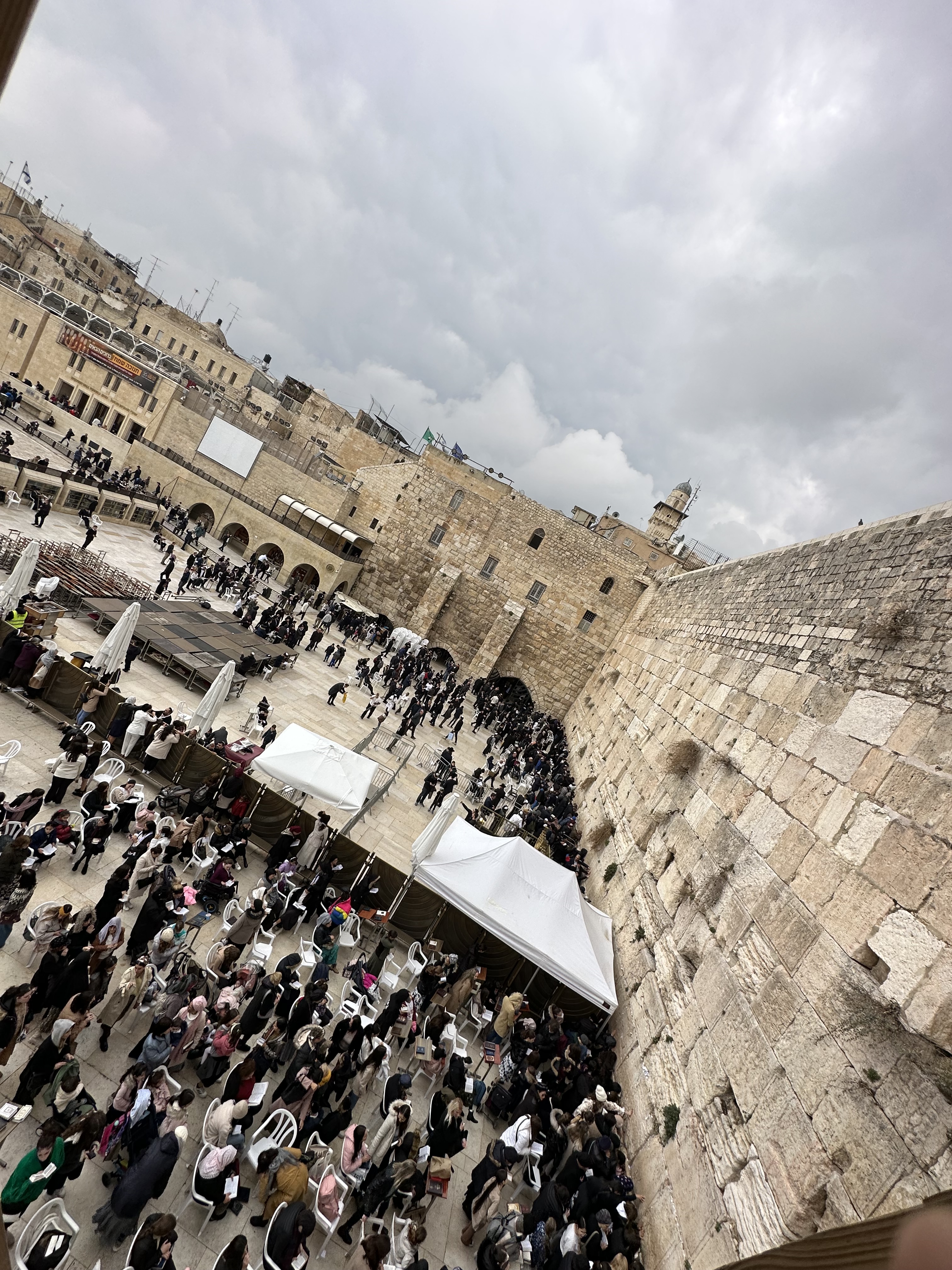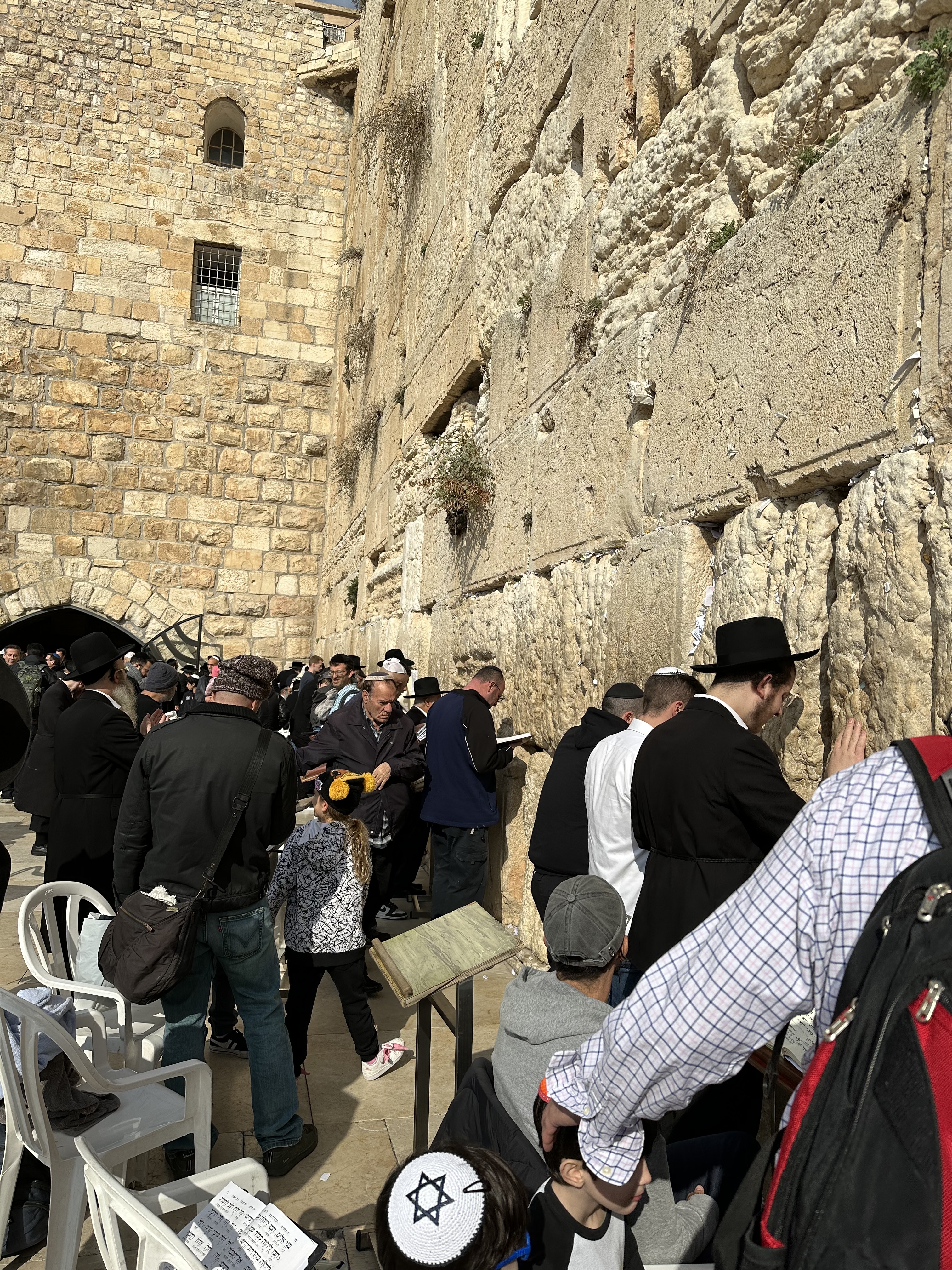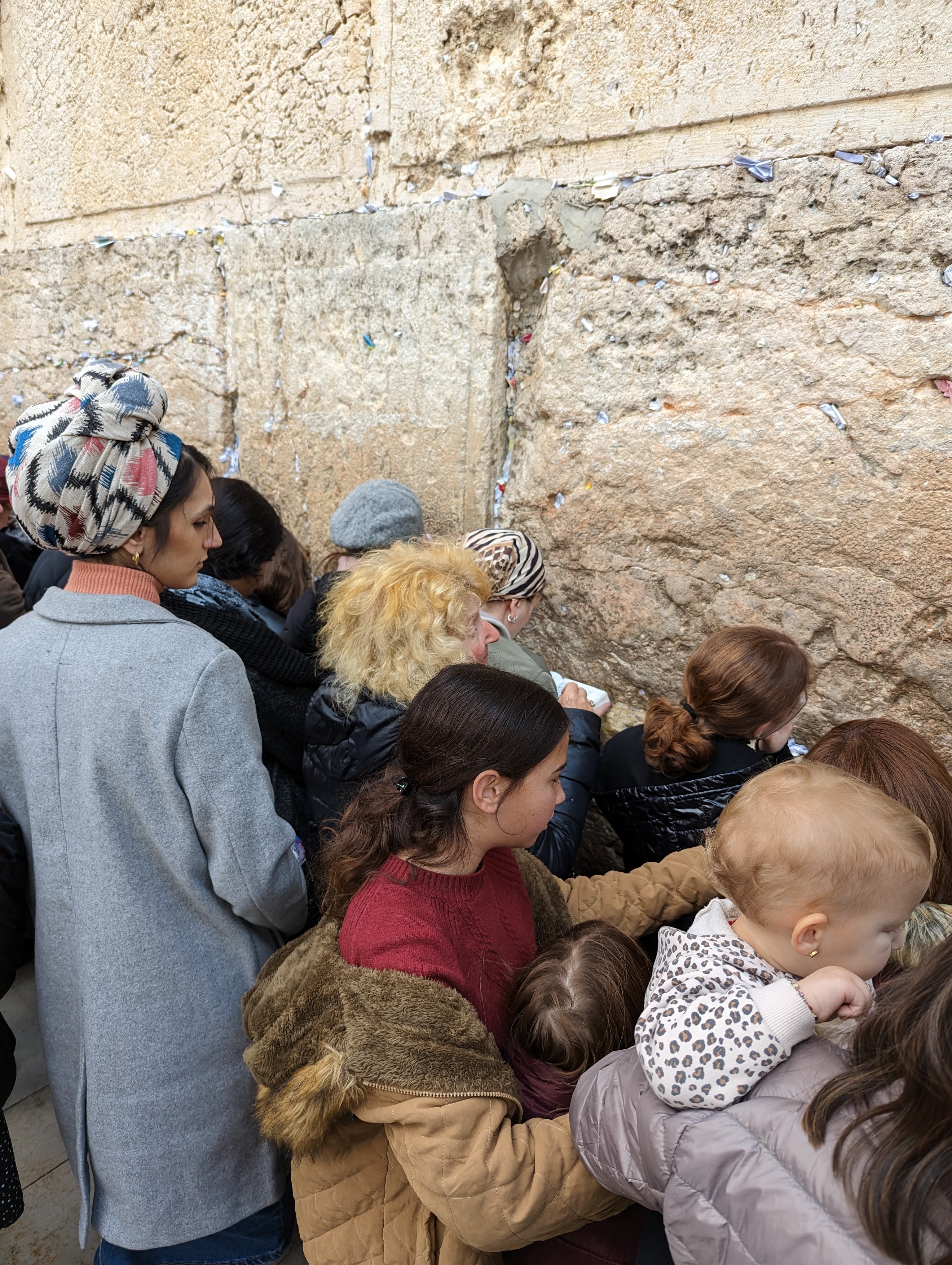 We follow the tradition of stuffing a small piece of paper into the wall on which you’ve written a prayer, a hope, a wish, a blessing. We cannot all do this together as the men are separate from the women. The full spectrum of faith is here at this holy place, us reform Jews included among the ultra orthodox davening at the wall with their prayer books open, an arm wrapped with tefillin perched on their heads. Their prayer chanting sounds holy and ominous at the same time.
