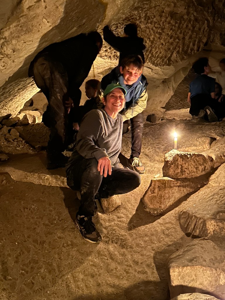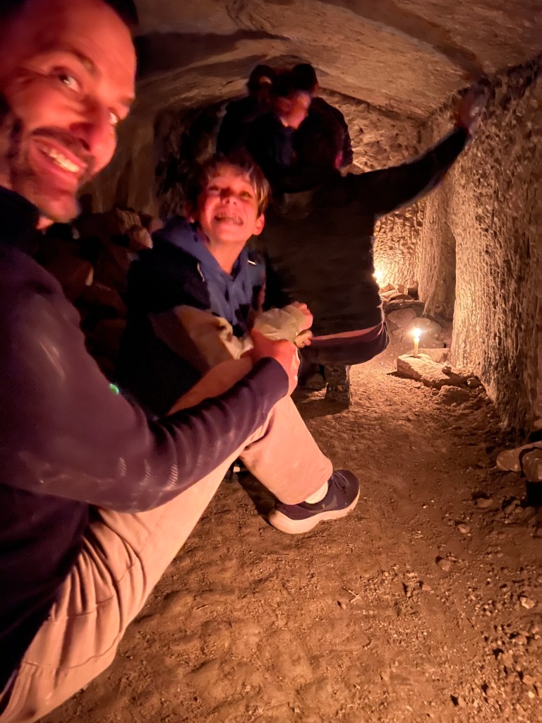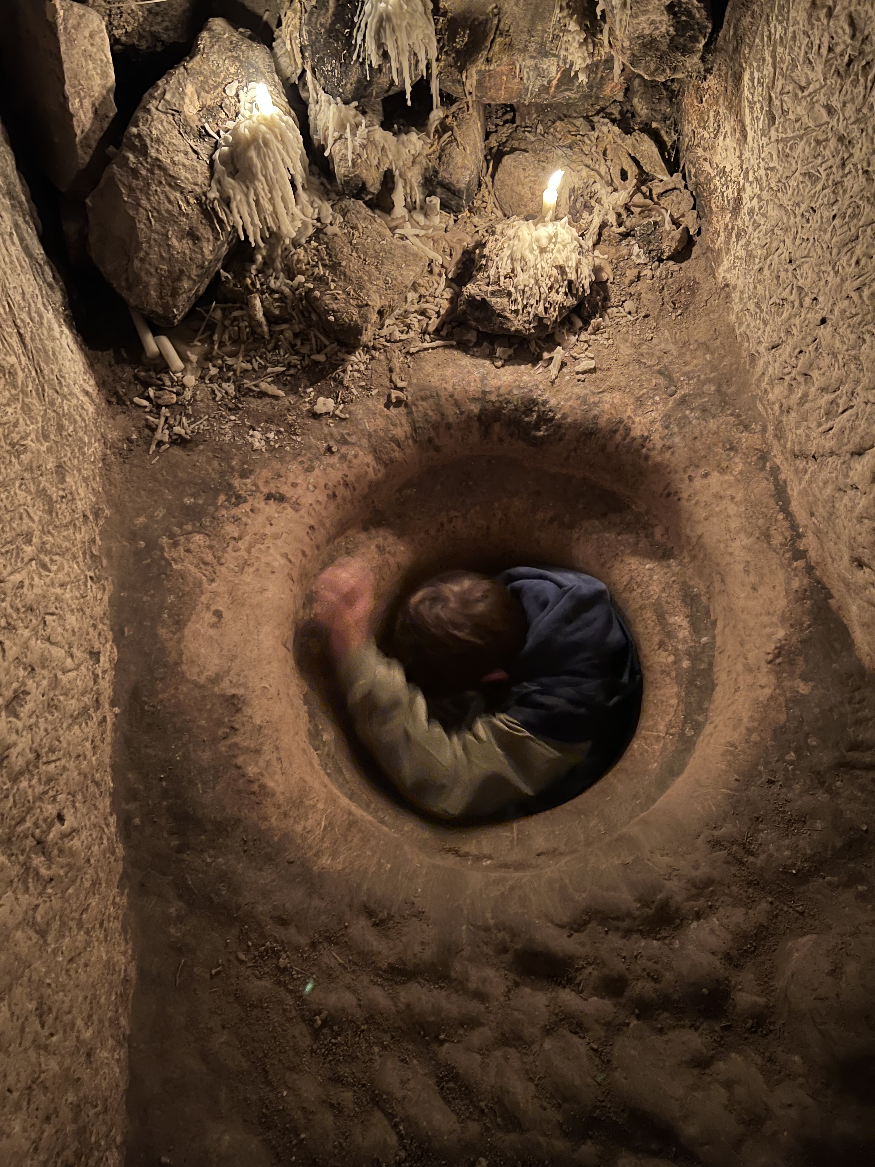 Now that we are experienced archeologists, we are invited to do a “cave crawl” at a site that has been dug out just enough to make it through. Not for the claustrophobic! There are places where we have to slide feet-first on our butts, and a spot where we have to lower ourselves through a hole. It’s all lit by candles, no stairs, no path, no real sense of which way is out. We have become discoverers of an ancient civilization.