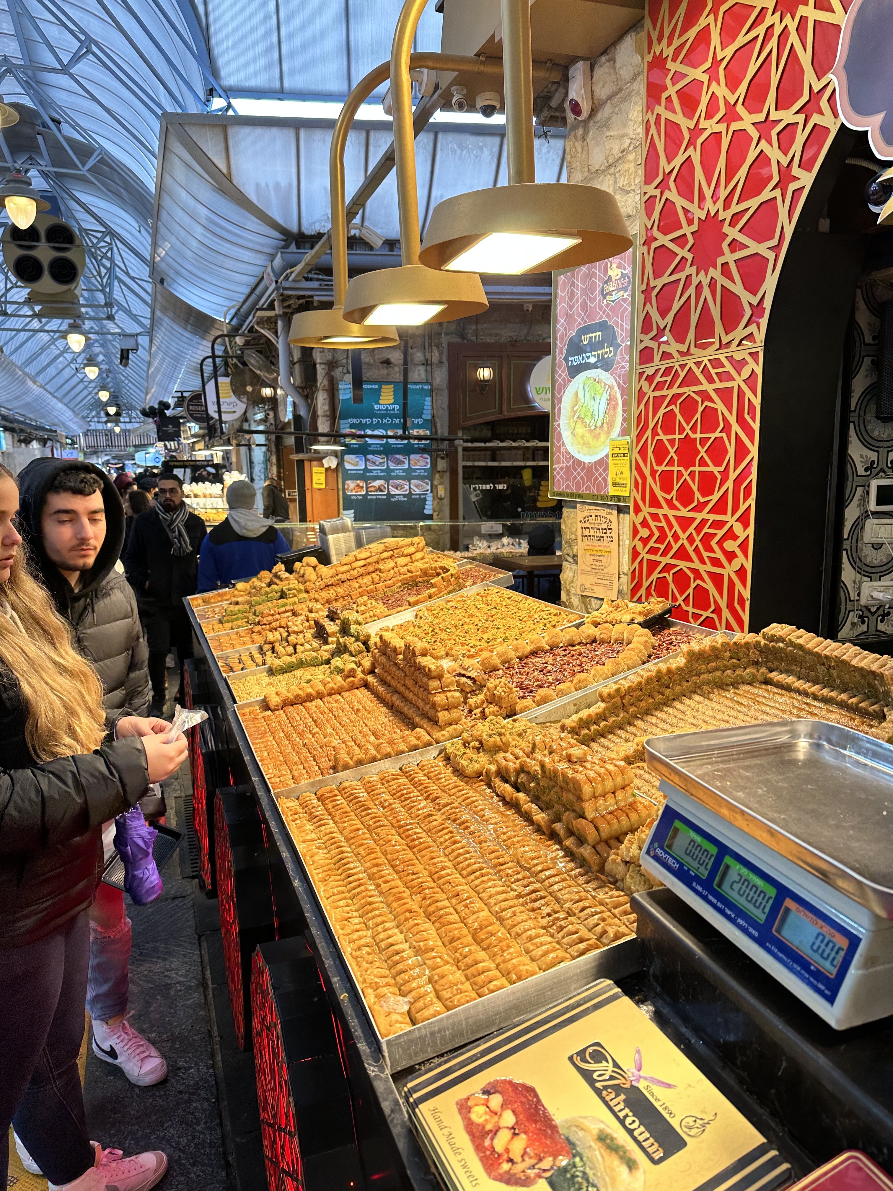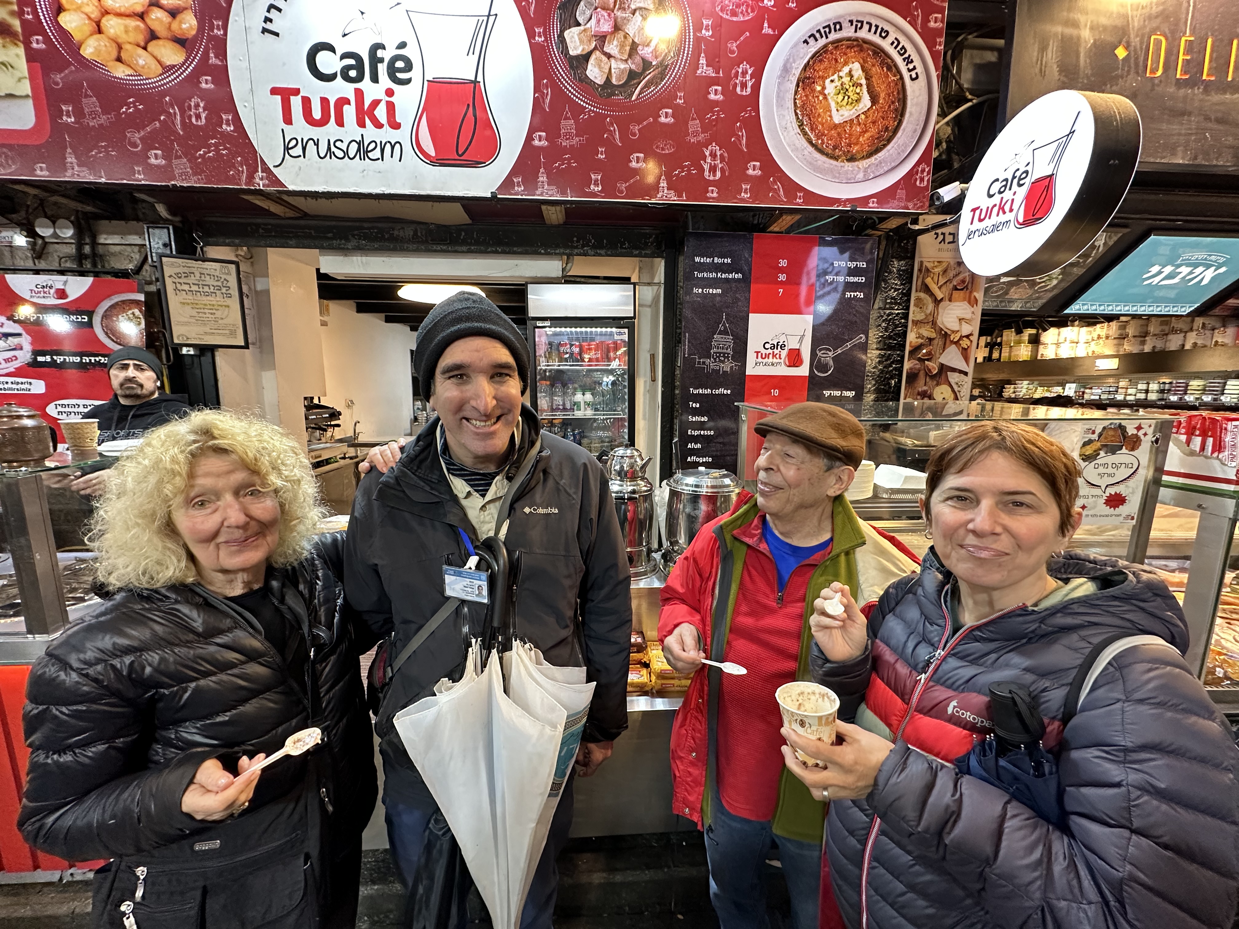 Joe and Hilik had gone for soup (borscht, anyone?), and then joined us for market explorations. It is noisy and crowded and colorful and brimming with abundance, row after row, aisle after aisle, locals with strollers and wide-eyed tourists angling to get by each other. Markets are such a fantastic window into cultures and peoples…I could wander around here for hours, and have to buy some spices and halva. Hilik treats us to a sweet Turkish dessert – sort of a thin corn pudding served warm with cinnamon. Delish? We were a house divided, I’d say.