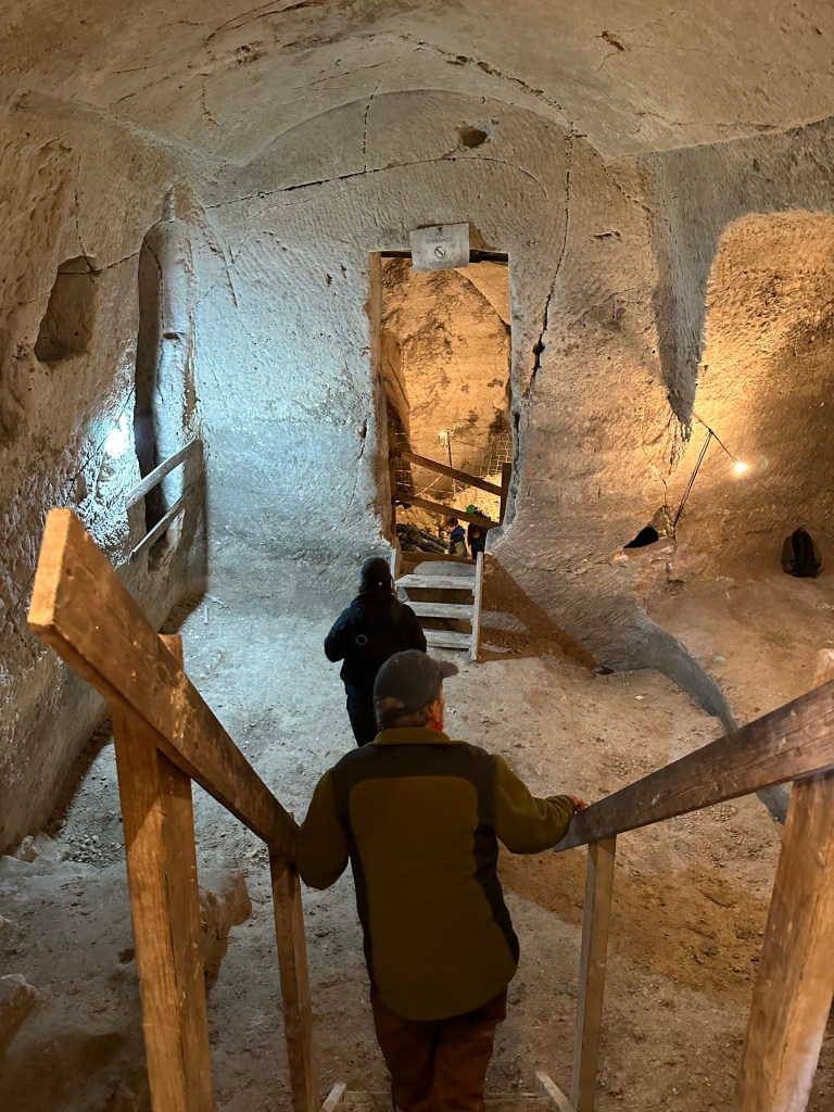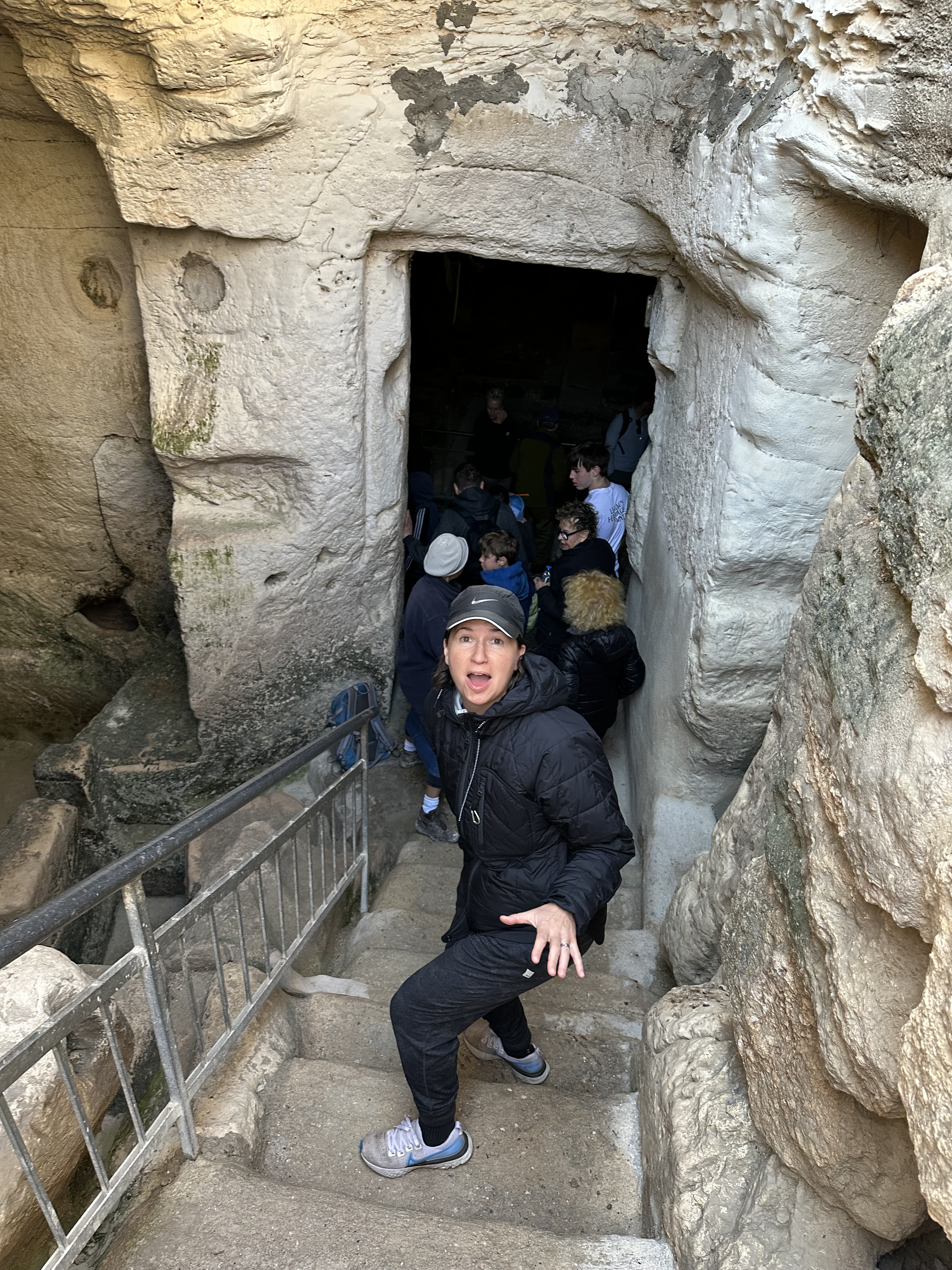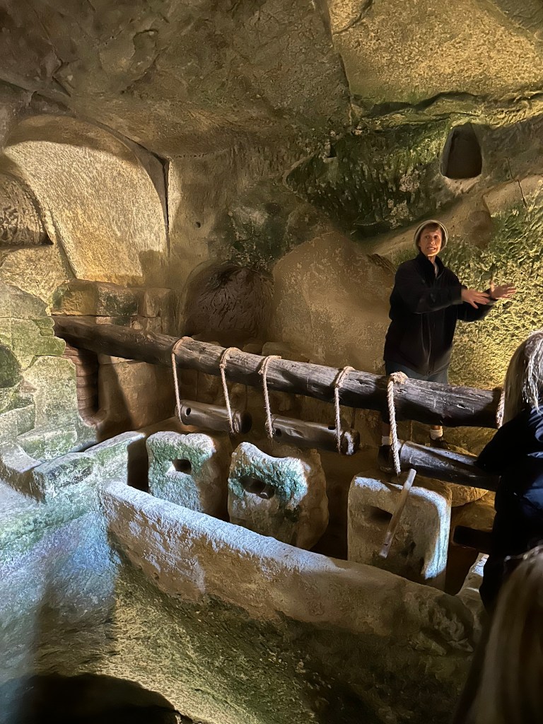 Roll the tape forward a couple thousand years, and we get to dig into their lives…literally. In a cave that was once an olive oil press and processing room, our energetic guide gives us a brief introduction to this place and its history. We are reminded that olive oil was used not just for cooking, but also lighting and ceremony, so they needed a lot of it.