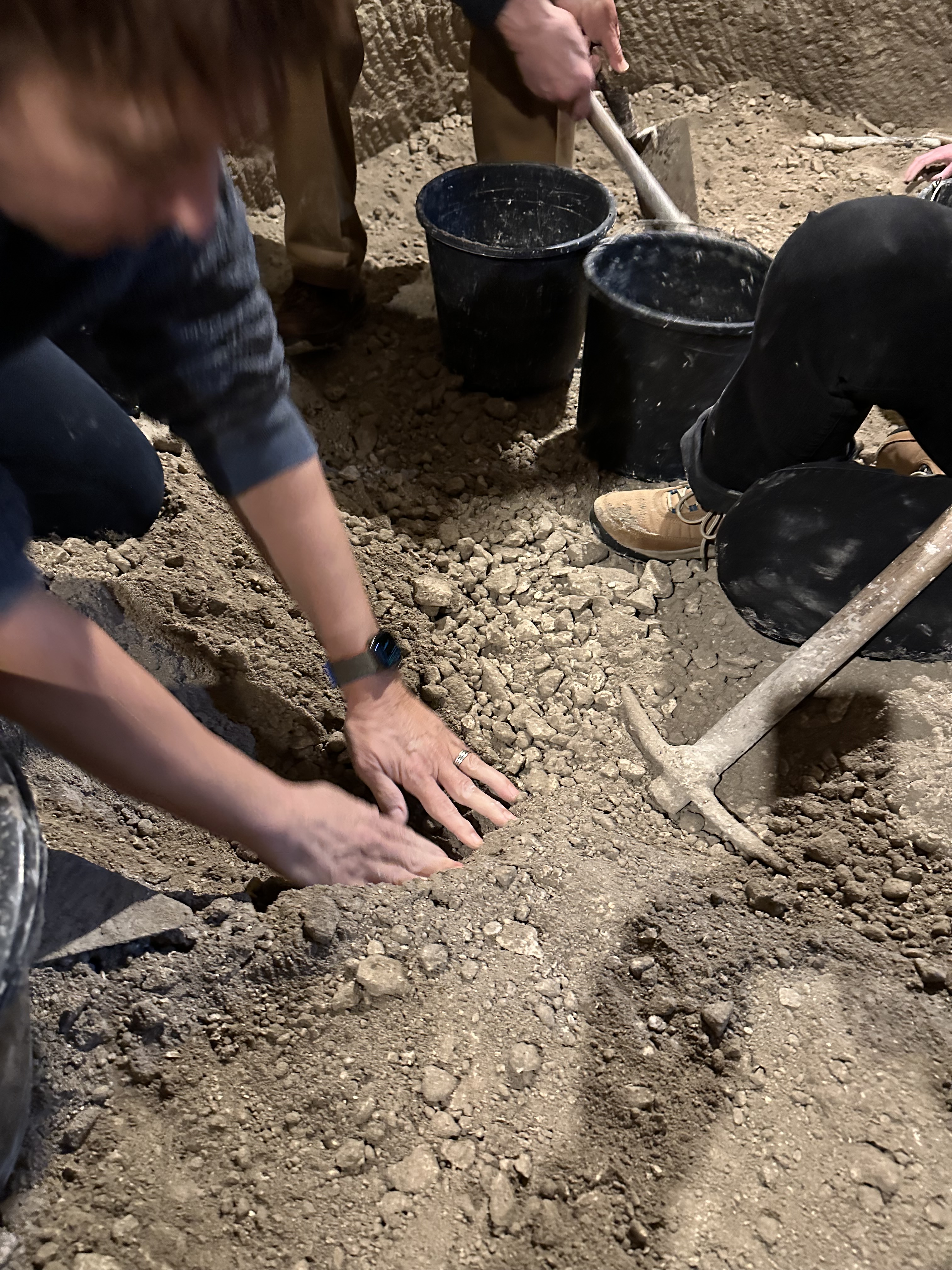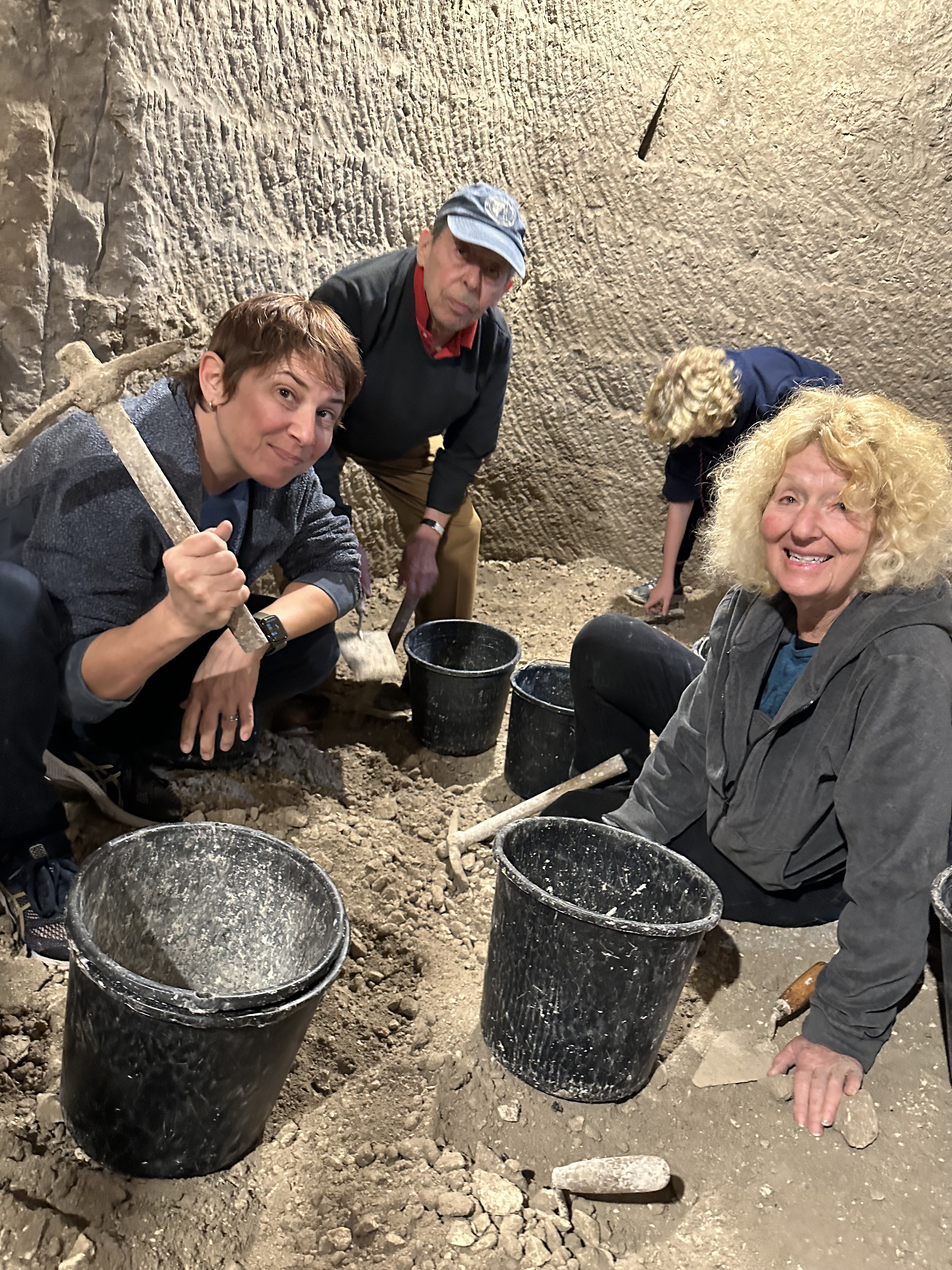 From there we went into the excavation area we’d be working in (wearing dirty clothes, per Hilik’s advice). A rickety set of makeshift steps take us down to the main dig, lit by bare bulbs strung about the place, the air dry, stale and motionless, tinged by the dustiness of the dirt. We get a quick lesson in how to use the pick and not break things we might find, and advice to fill buckets no more than 2/3 since we have to schlep these things out of here (via a good ole bucket brigade lineup).
