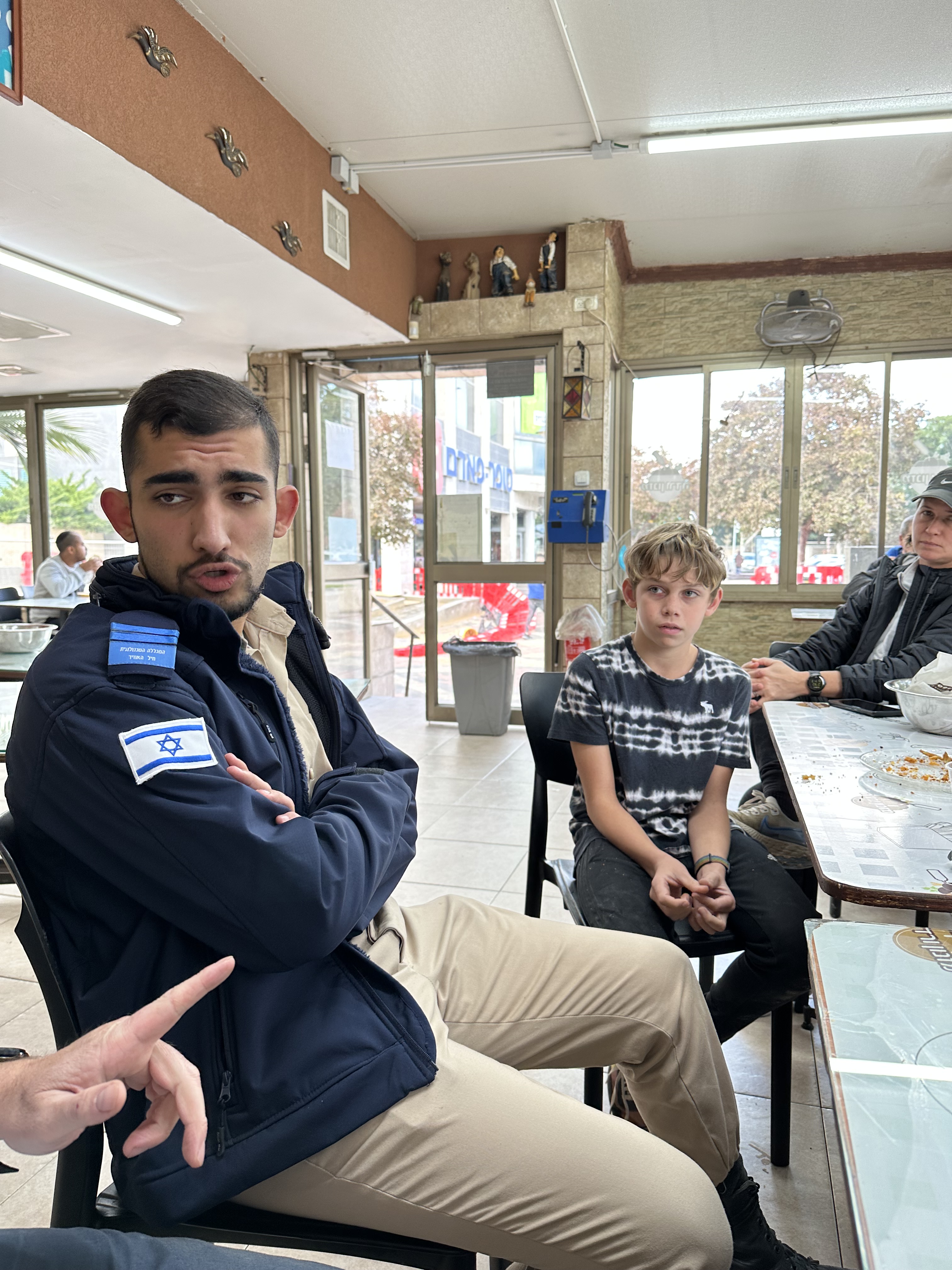 Having proudly contributed to the understanding of our ancestors, we stop for shawarma and falafel at a local eatery. A young guy in a military uniform – he turns out to be 17 – is at the next table with his father. Soli has been somewhat obsessed with the military, and it’s everywhere, and mostly young people since Israel has mandatory service (two years for women, three for men). Hilik asks the guy if he would chat with us, and he’s happy to do so (with Hilik translating). He is studying at the nearby air force academy, preparing for his military service that will focus on technology. He does not plan to have a military career, but will stay longer than the minimum as that provides advanced education benefits. To hear a 17 yr old kid be so clearly on his path is just amazing, and makes us all wonder about our American youth…