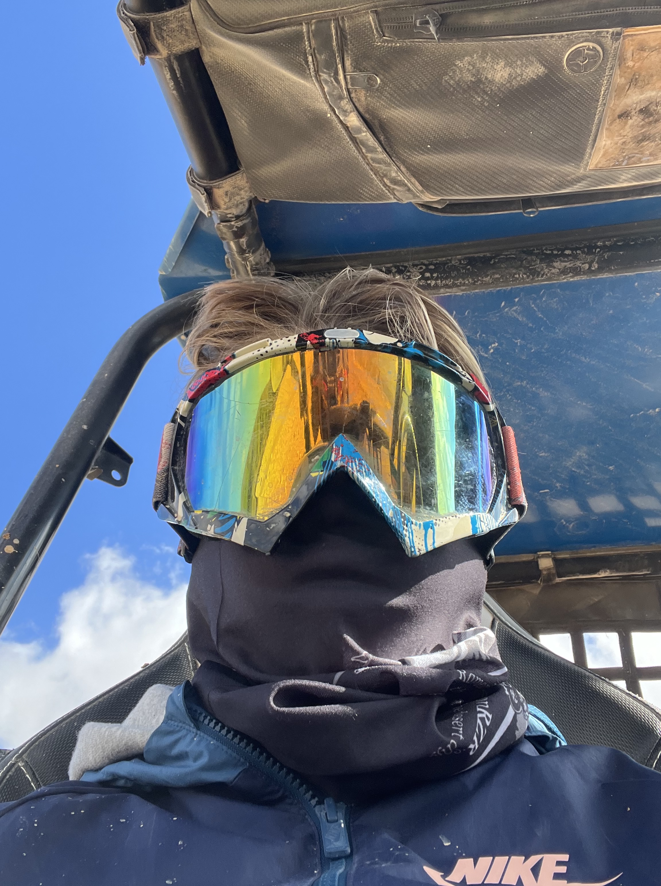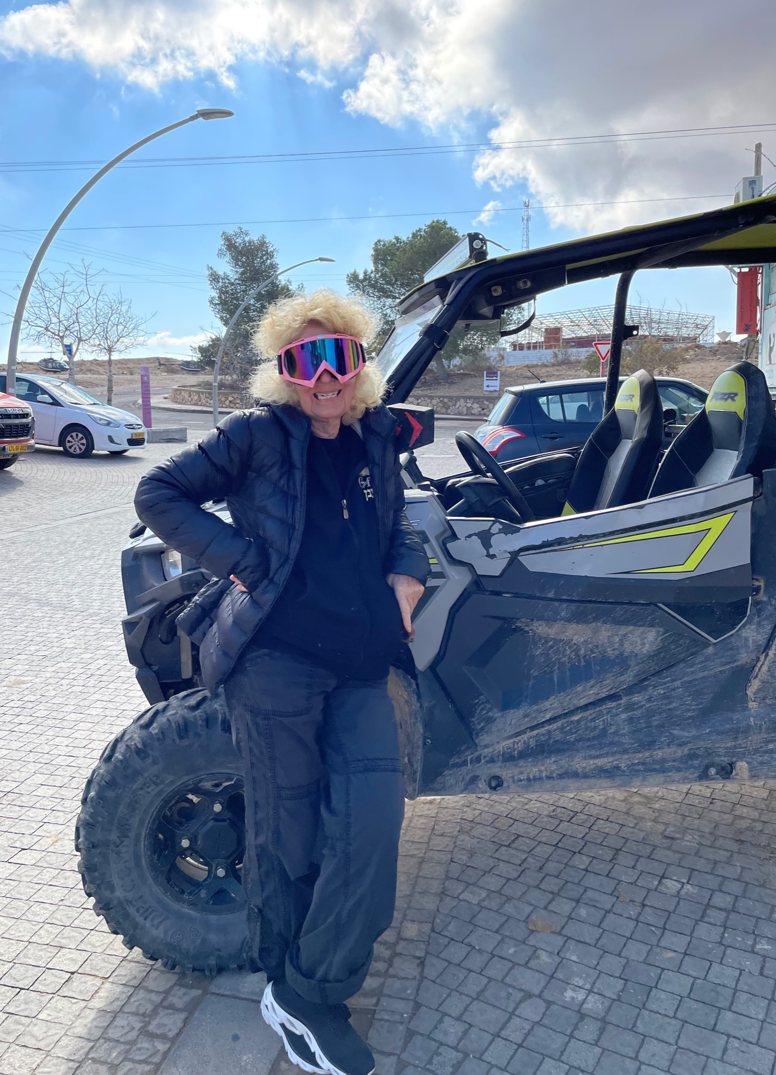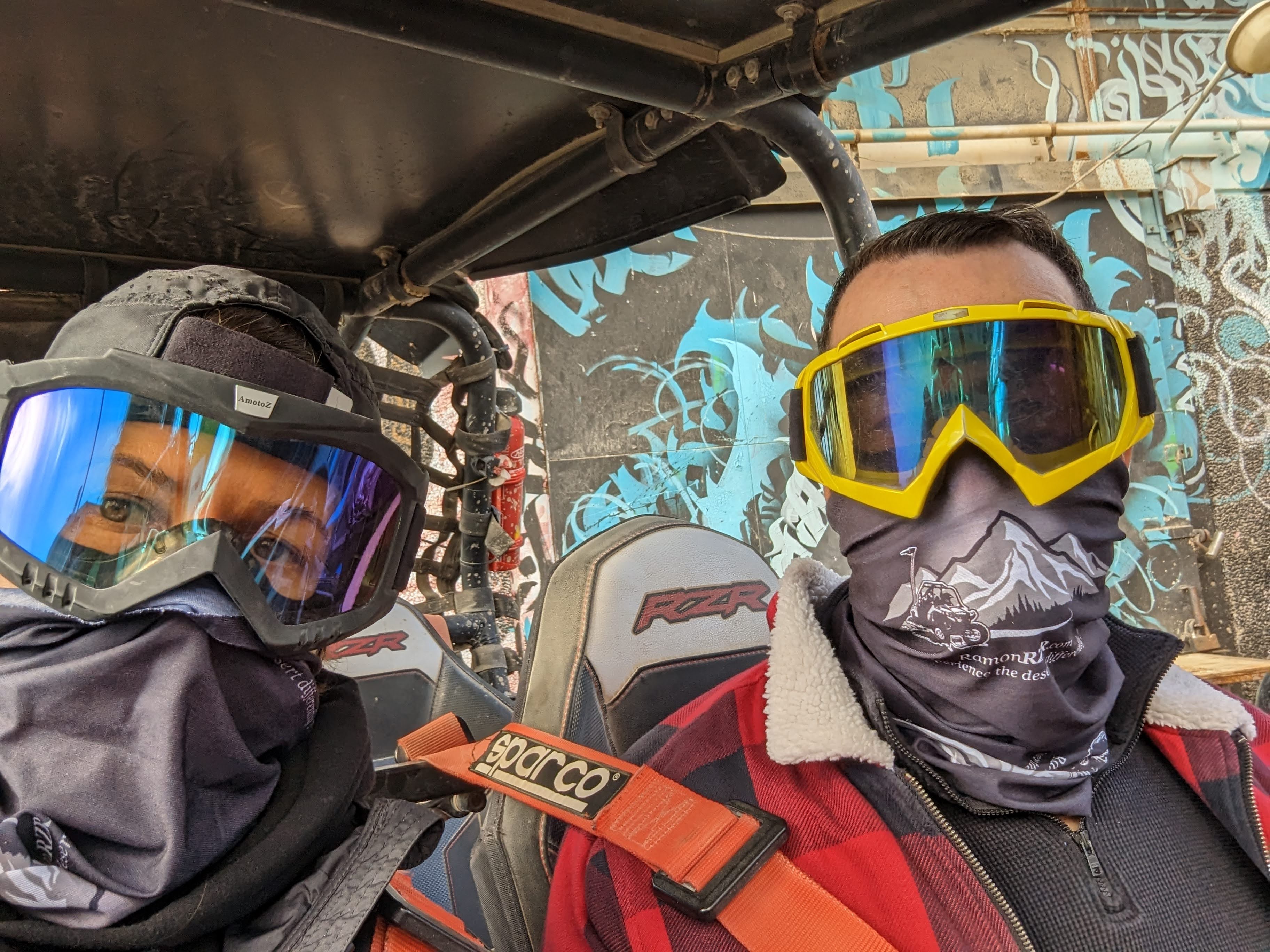 We meet up with Chaim at their warehouse in an industrial area that is also very artsy with galleries and cafes. We sign releases (did anyone read that?), get our safety briefing, a quick lesson on how to drive this thing and helpful tips (when you go through water, do NOT stop), and we’re off! We start slow, but are quickly rolling along and it’s a BLAST. Chaim says to keep up with him, and we do just that – bouncing around, leaning through corners, up little hills and down small valleys, over some small lakes the recent rains have left behind. It’s dirty and splattering with mud and the engine revs loudly – but Janell and I still manage a rendition of “slip sliding away” as we glide through the slick, water-filled ruts.