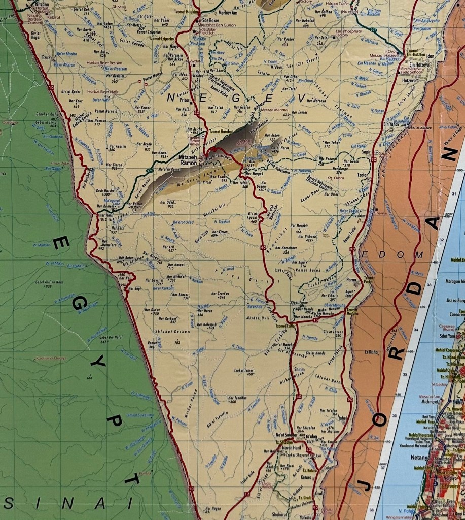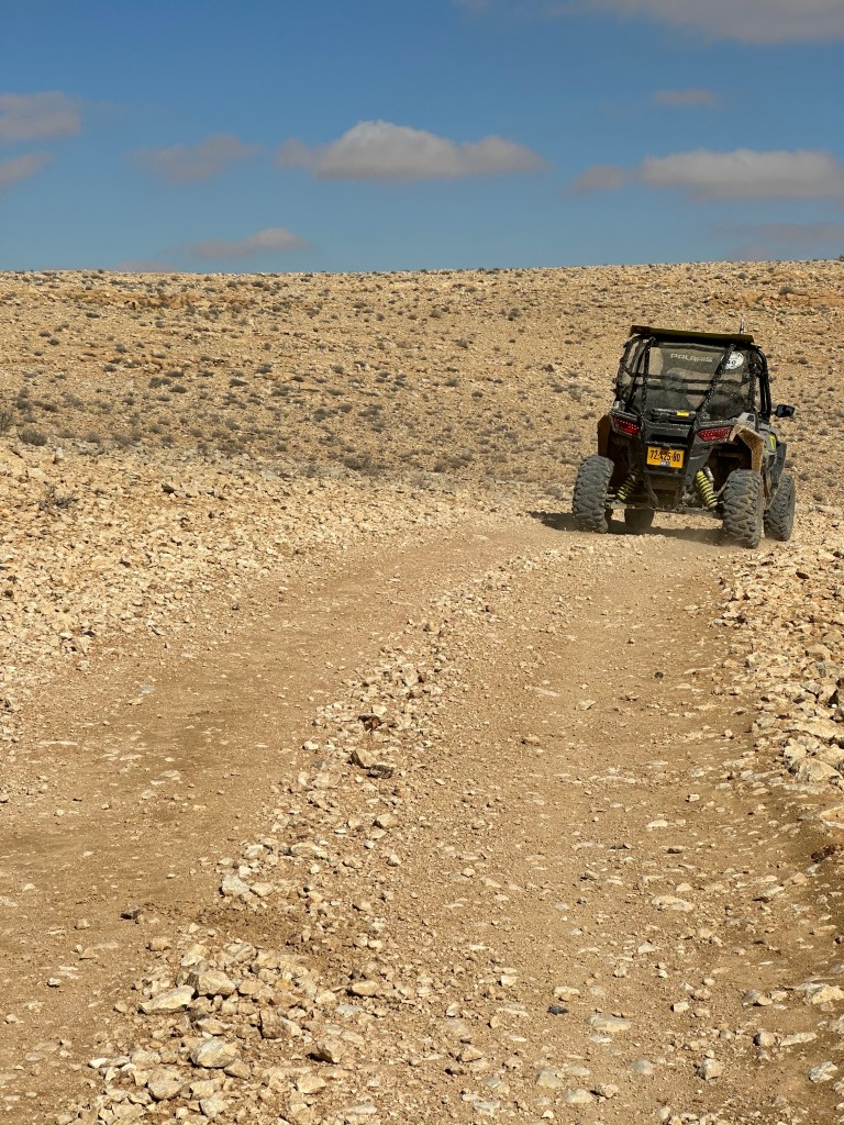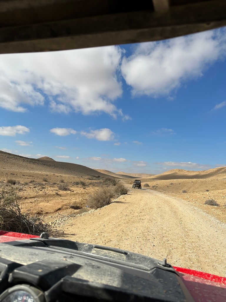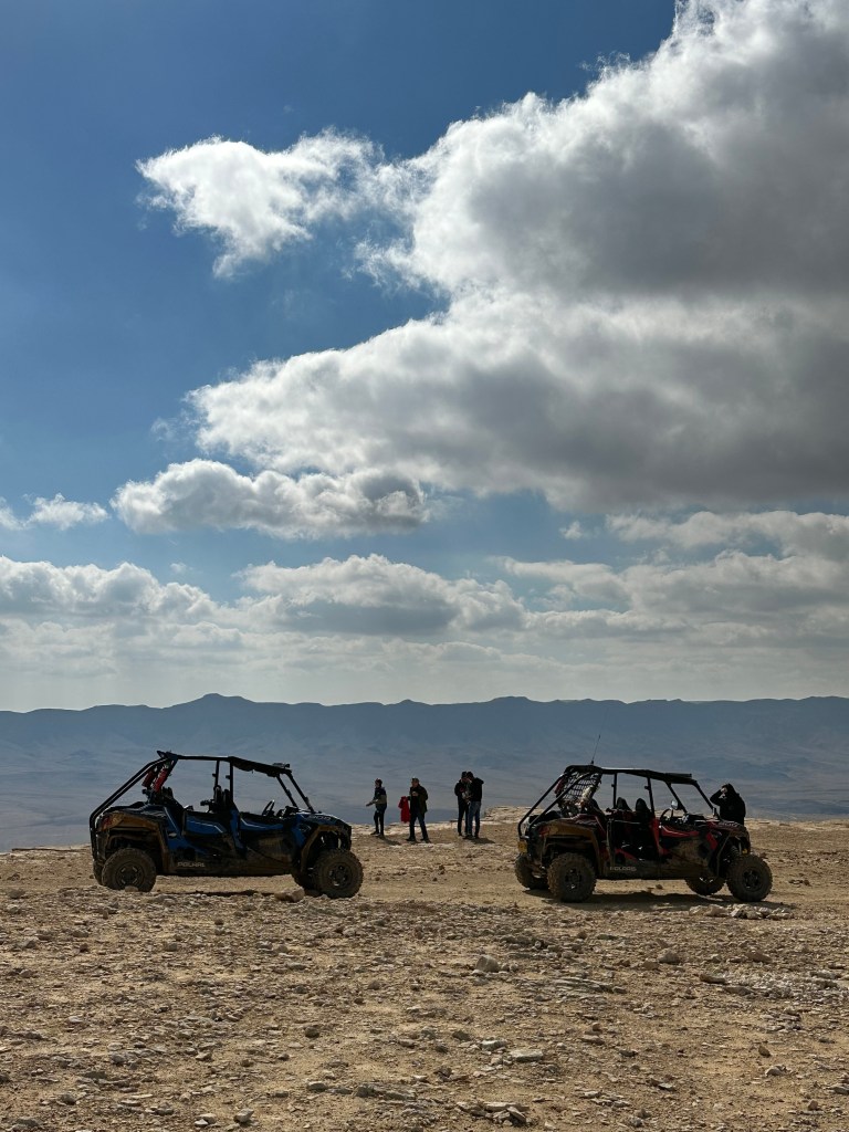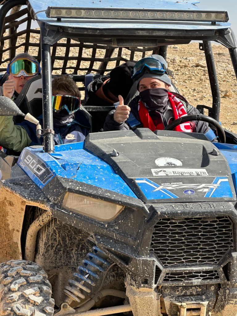 As we’ve done for many days now, we gather in our trusty van with Hilik at the helm, especially excited about our first stop: Mizpeh Ramon, where we will get to ride ATVs (“I wanna drive!”) through the desert. I pictured ATVs that would be more like a four-wheeled motorcycle if you know what I mean, but no – these are jeep-sized, four-seater, beefy, knobby-tired, rollover-no-problem, all terrain beasts! Woo hoo! This is gonna be fun.