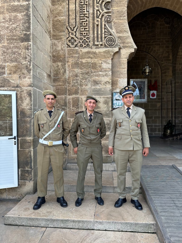 The hotel calls a taxi for us (which turns out to have been completely unnecessary – taxis are everywhere), which takes us to the Habous district. Our destination is the “new Medina,” a bazaar of shops and cafes much smaller than the “old Medina,” the latter not really recommended for tourists. The taxi driver does his best to basically become our driver for the day – “…for 120 dirham, I’ll wait one hour; for 200 dirham I’ll wait two hours…as long as you want for a price and I will take you back to the hotel. Or I can drive you around the city to…” We politely decline, and the taxi drops us on the corner of a random street, pointing to the way we should walk. In front of us is the “palais,” [palace] with guards stationed outside. Turns out it used to be a palace and is now the seat of what we understand to be the state’s governor. The guards are very friendly as we ask questions about the building in front of us, and when we tell them we are going to Merzouga, one becomes very animated and talkative telling us he is from there. He is proud of his heritage.
