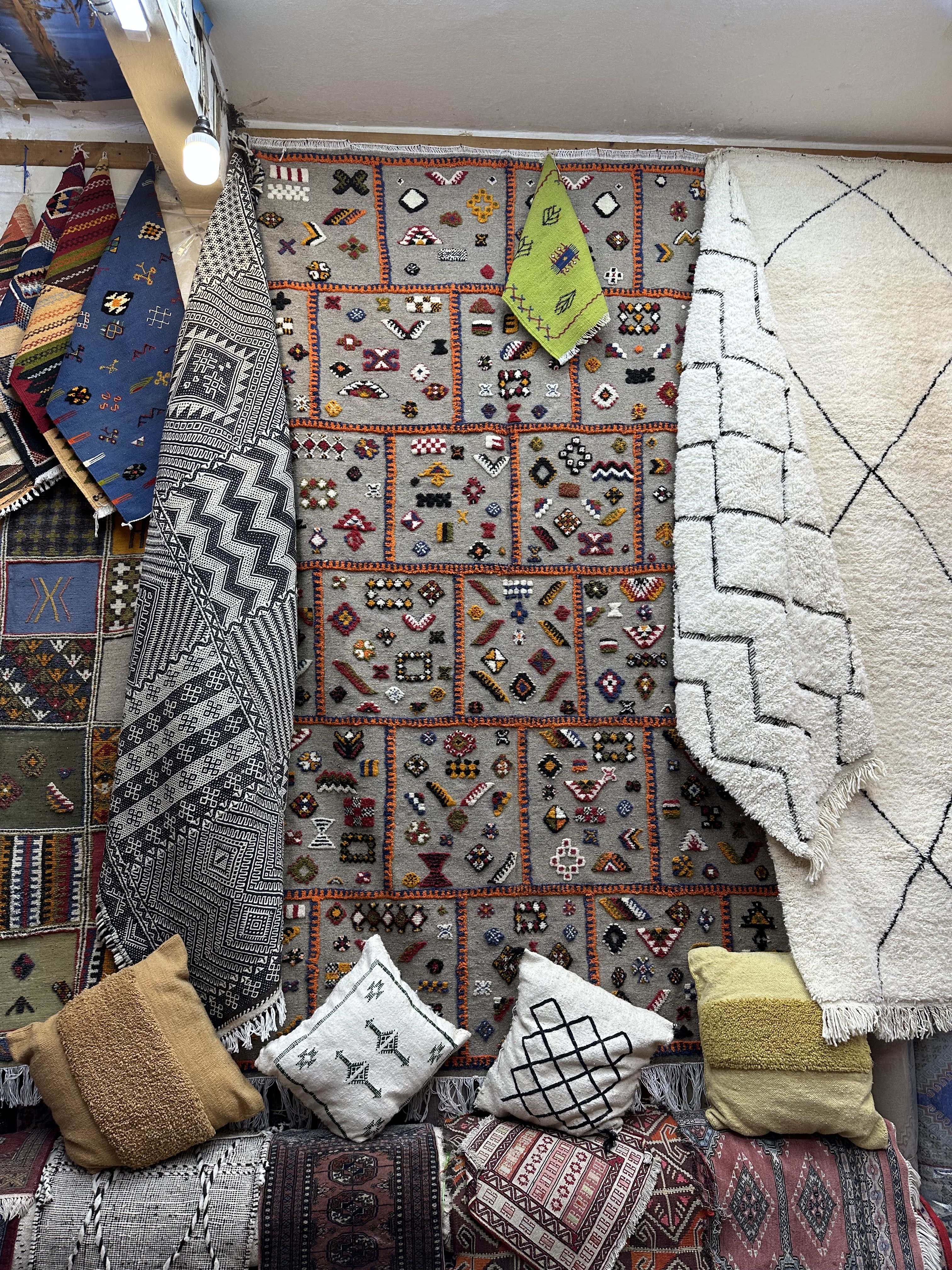 The shopkeeper Farhane is gracious and friendly, and much like the others, he is not aggressive in trying to sell us something. That is such a pleasant change from other markets like this. He shows us many rugs…large, small, rough, soft, new, old…and then takes us to his other shop across the street where he has even more! I seriously consider buying a rug but wonder where I would put it. We ask Farhane for a lunch recommendation, and he directs us to a tiny cafe “just to the right down this street.” We think we end up at the right place, and although he had recommended the tagine, we opt for the special variete de couscous, only available on Friday, as the man at the table next to us suggests. A local’s advice is always a good bet…and it doesn’t disappoint. Very tasty – although there was that one mystery vegetable – and WAY too much to eat.
