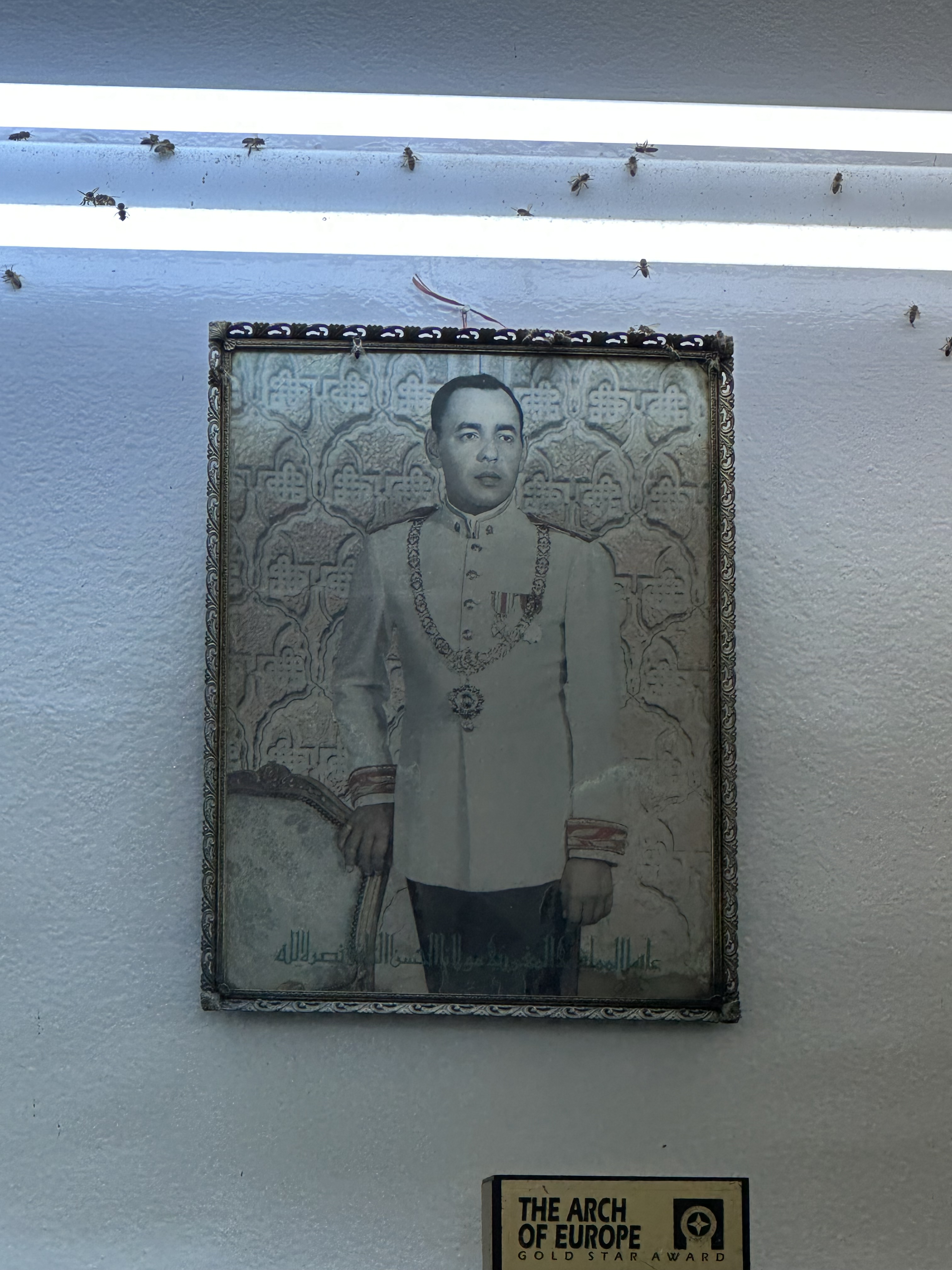 Oh – that bakery?! Of course we go back! Farhane had told us it’s the best Moroccan cookies in all of Morocco, so how could we not? We say farewell to the neighborhood cats that have accompanied our lunch, and wander back through the square past the taxi drivers chatting and smoking (everyone here smokes, it seems). In spite of the large Patisserie sign outside, the doorway gives no clues to the small space but fragrant and robust operation inside…capped by a picture of the king under a fluorescent light covered with bees. And a fantastic display of little cookies lining tiny the room…rolled in powdered sugar, sesame, almond, chocolate, pistachio…we choose enough to fill a small box and pay about US$4 for the tasty delights.