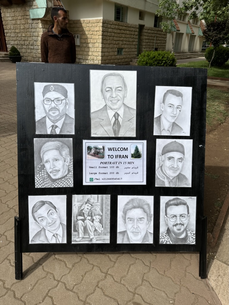 The streets are quiet heading out of the city, and become even less populated as we head toward the mountains. We pass the time chatting and looking over yesterday’s pictures, staring at the day’s Wordle, and soon Adil is telling us about our first stop, Ifrane. It’s cooler up here at about 5,000 feet, and green, and is not at all like a dry North African town you imagine. Feels a bit like we are at a country club…well-kept landscaping, pretty little streams placed just so, green space, a house here and there. Then some guards stationed at gates – yep, there’s a presidential palace behind those walls.