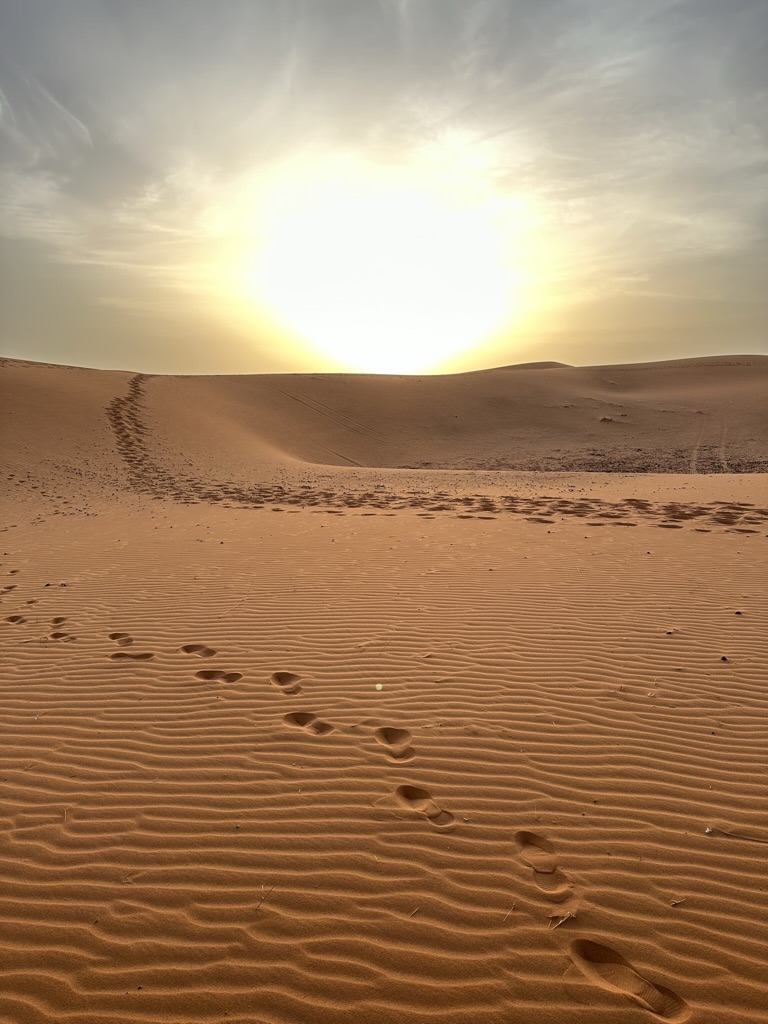 We venture up the dune, labored steps through the thick falling sand that is much harder to walk in that you’d think. There are chairs perched atop, waiting for us to watch the sun sink below the horizon and greet our camel-riding friends as they arrive.
