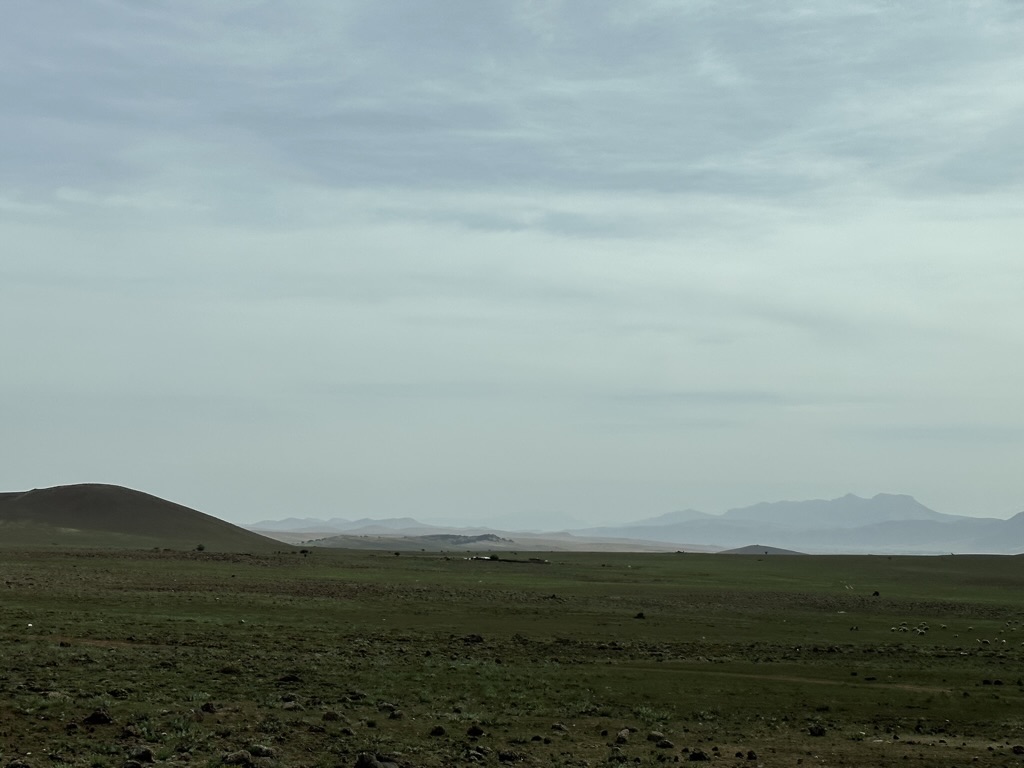 A brief stop at a gendarmerie checkpoint and we are waved through. The rocky hills pass by the windows in an endless stream of sameness. The high plains can be like that. The locals take advantage of the abundance of rocks, paint them white, and write messages on the hillside…