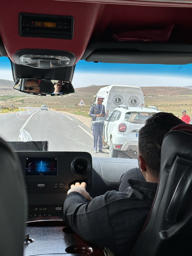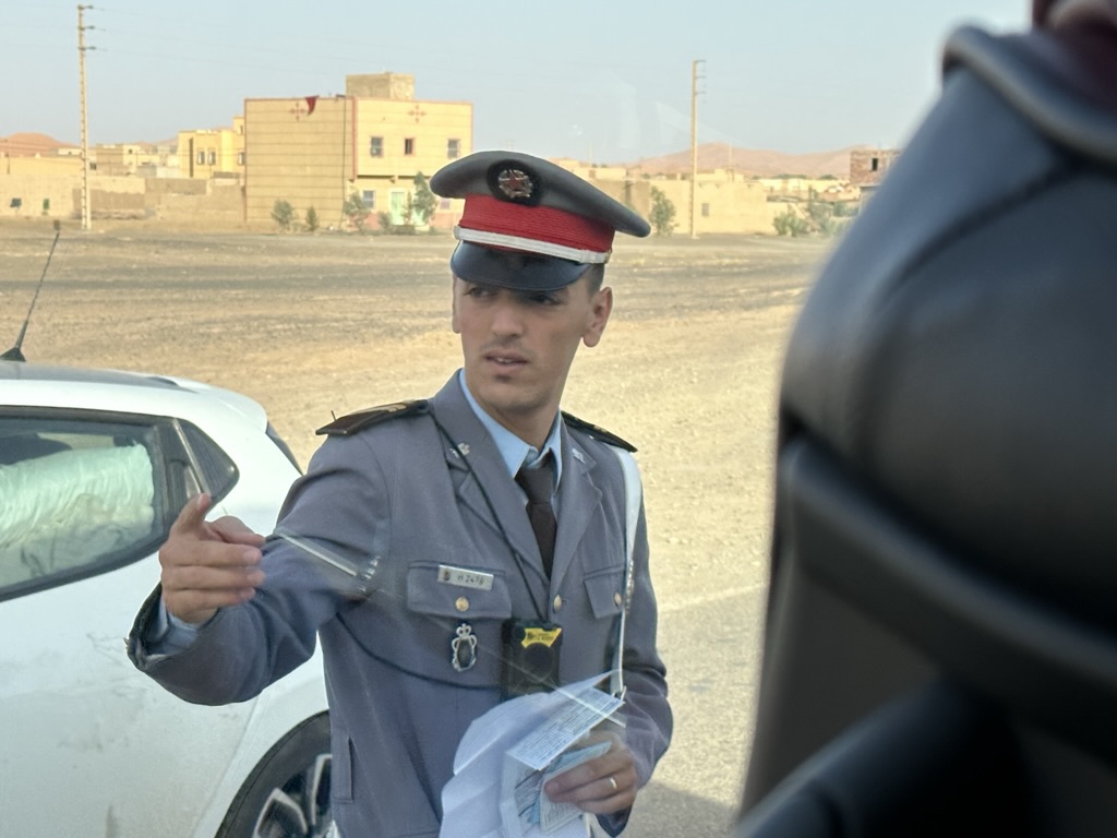 And there they are, bit by bit. The sand dunes – no, sand mountains – start to appear. But STOP! The gendarmerie pull us off the road and ask for all sorts of documentation, including a disc that Yusef took out of a monitoring device above the windshield. I had wondered why we often were going so slow, exactly the speed limit; apparently commercial vehicles are equipped with tracking systems that log speeds and stopped times. Of course everything was in order, but it took a solid 20 minutes for this to all play out.