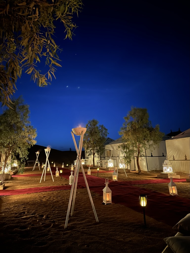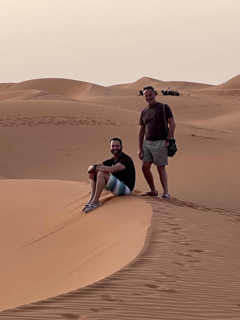 After dinner (yes, tagine once again but some new side dishes and we brought wine so we are happy), everyone in the camp – it’s not just our group here – gathers around the fire for some evening relaxation and entertainment. The air is clean and chilly, the sand cooled between our toes. And our hosts who checked us in, set out hors d’ouerves, made the camp fire, cooked and served dinner, and cleaned up, are now performers on drums. Three young guys out in the desert taking care of tourists, day after day, night after night, smiling and friendly…we think about this, our experience wonderfully romanticized, and theirs one of hospitality work. We gain a new appreciation for what they are giving us.