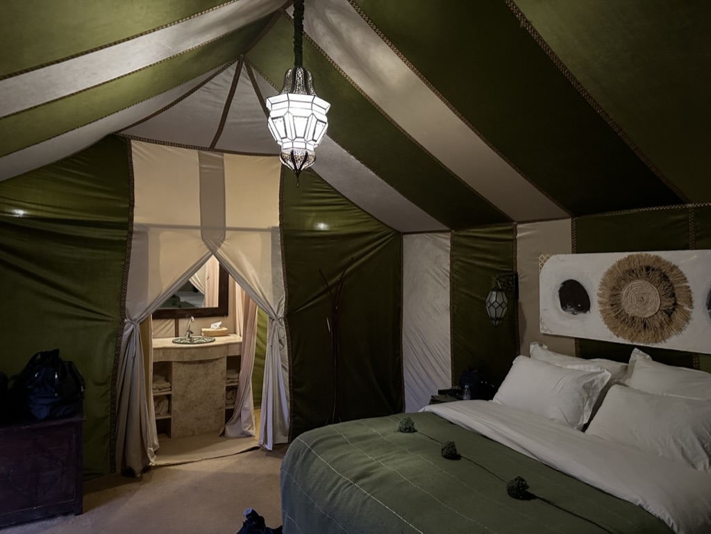 Bobb and I do not for a minute regret passing on the camel ride. It is just spectacular to be here with some daylight left, and it’s peaceful and quiet, no one else in the camp yet, save for the three young guys who work here. We get “checked in” – not so much a process as a “which bags are yours?” and “let’s go find an empty tent with two beds.”