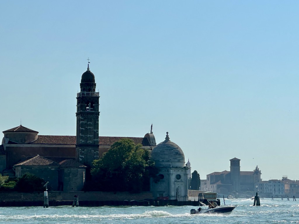 Early afternoon arrives quickly, and as we coordinate a taxi to the cruise terminal, we strike up a conversation with a waiting couple (Jimmy & Cindy from Chicago), who are going on the same cruise (Venice to Rome…have I mentioned that?). We share the taxi that is just big enough for five and luggage. Somehow it is the same driver that took us to Locanda Cipriani, a handsome Italian (is that redundant?) named Simone. The ride through the Grand Canal is of course practical, but also romantic and glamorous as we bounce across the water, the center of Venice fading behind us and a great adventure ahead.
