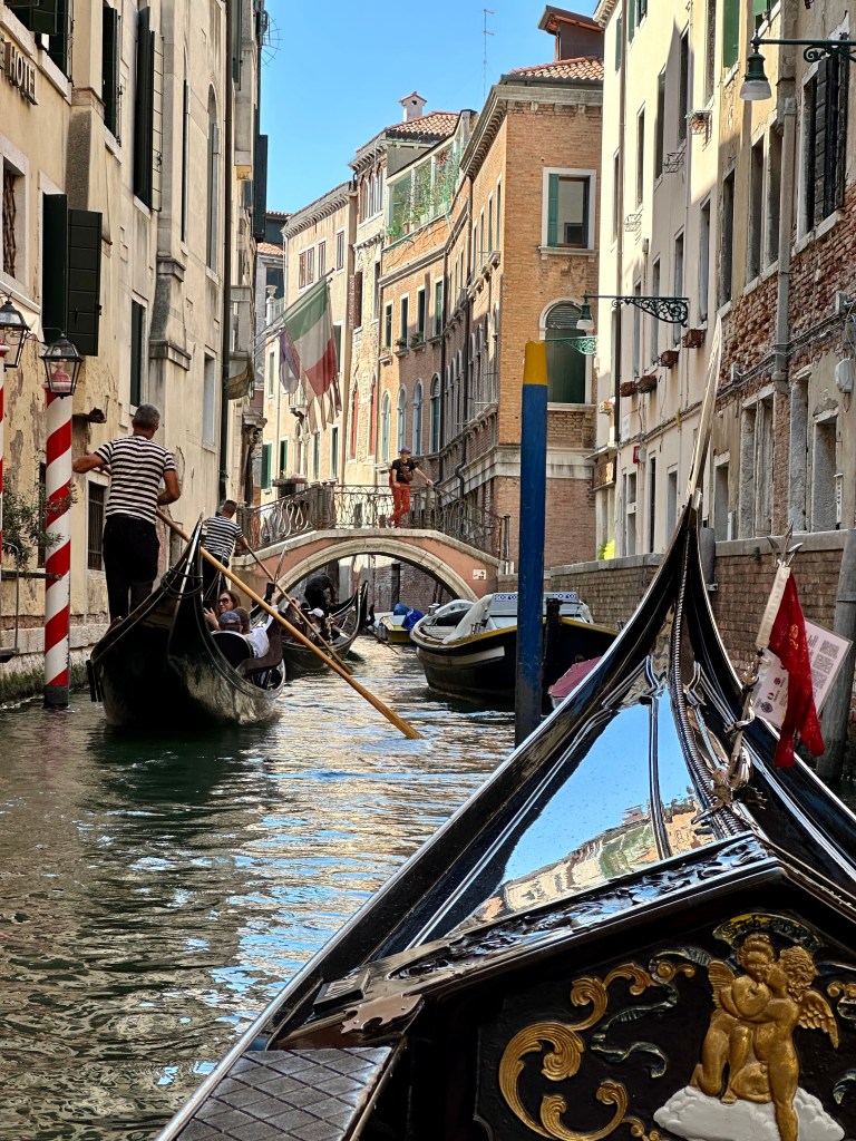 Another hot morning dawns, and we have some time before embarkation so Martine and I hire a gondolier, slowly exploring the nooks and crannies of Venice. Under bridges, around sharp corners, passing other gondolas, taxis, construction crews, and garbage collection (all of this happens on boats), our gondolier navigates with such precision it’s astonishing. He comes within an inch or two (seriously) but does not bump into anything…that’s when Martine suggests I become a gondolier. I think it will be better just to wear one as a hat…