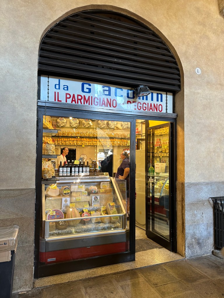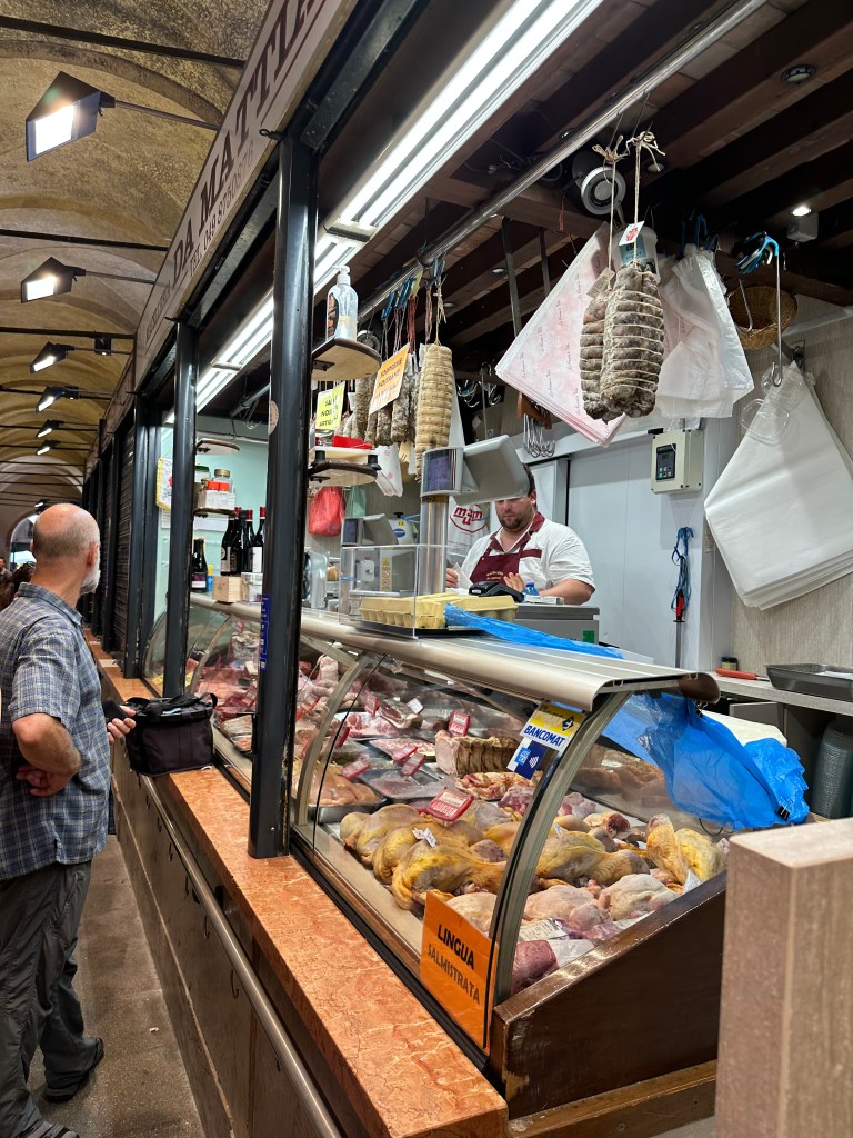We walk through the the green market (fruit and veg) and have a coffee and snacks under umbrellas in the Piazza delle Fruta. The lively Italian chatter of locals surrounds us, their dogs focused intently on the pigeons (that universal standoff). From the green market, we go “indoors” to the fish, meat markets, and bakeries that are below the Palazzo della Regione, the hallways and columns originally just foundation for the massive building above.