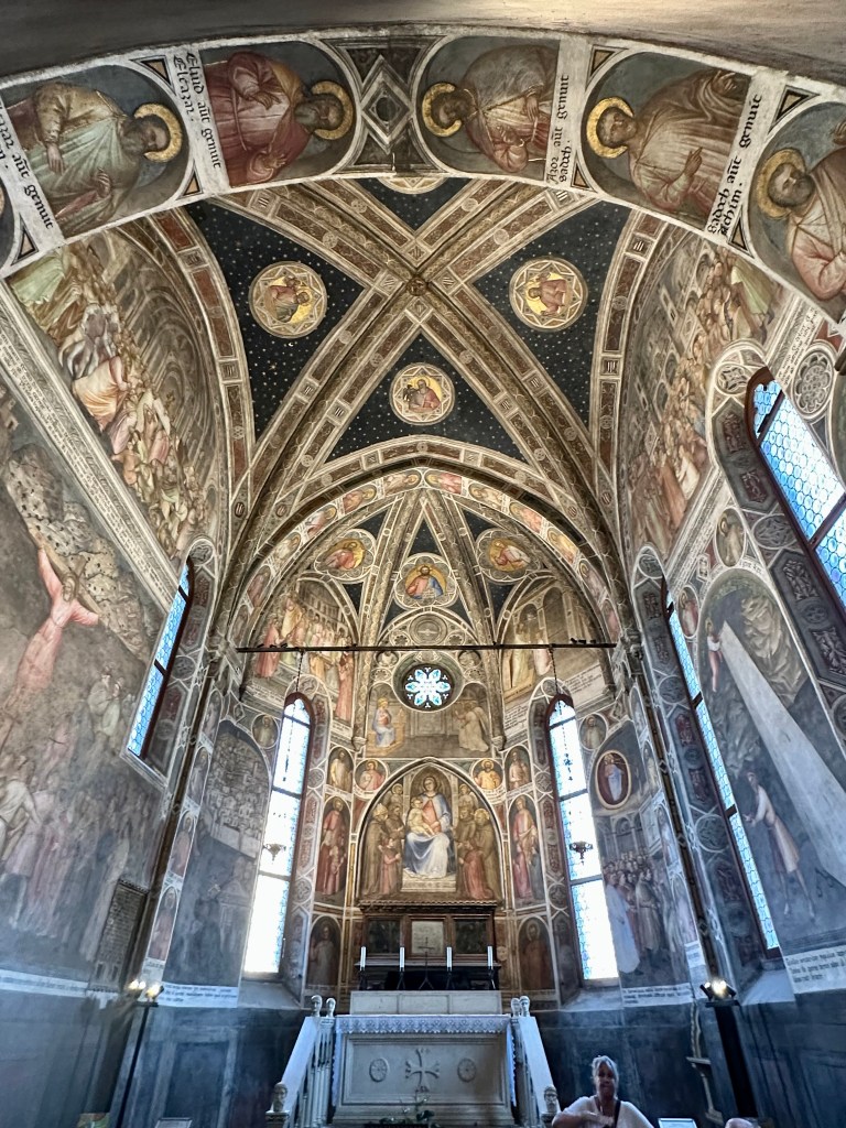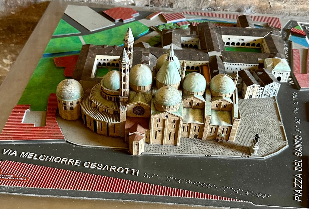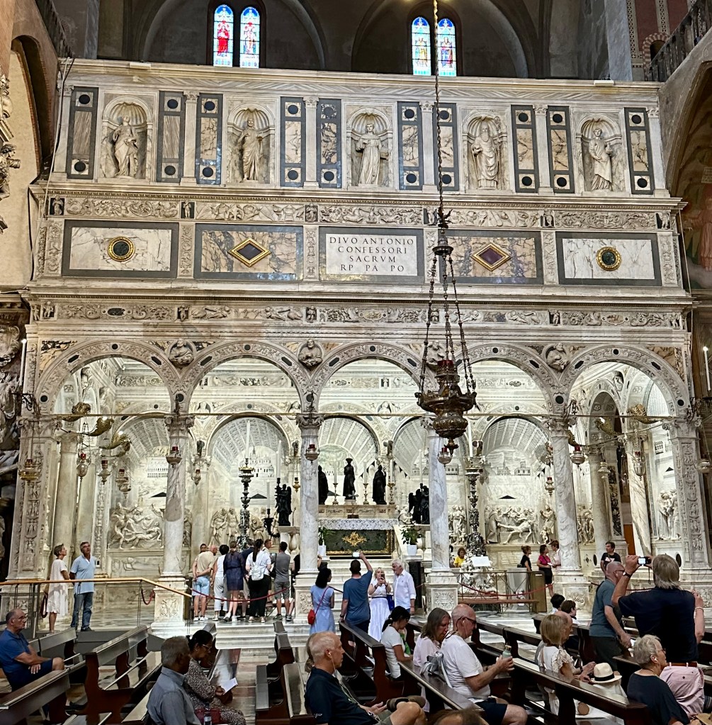 It’s a charming city, typical for this area, with small shops lining narrow streets and apartments above. Our guide is leading us to the highlight of this visit, the Basilica of St Anthony of Padua, whose bones are in the reliquary here. Construction began in 1230 and continued for decades (makes me think of the Sagrada Familia in Barcelona, which began construction in 1882 and is still not finished)..