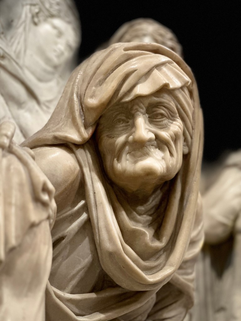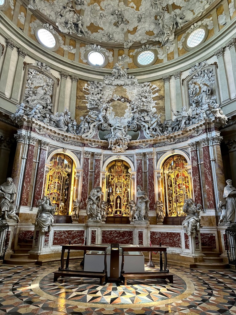 The intricately adorned columns throughout the basilica push the ceilings to the sky, so high above, every surface covered with fresco and marble, it’s almost frantic – chaotic – and somehow in harmony too. We linger and ponder the art and theology that surrounds us.