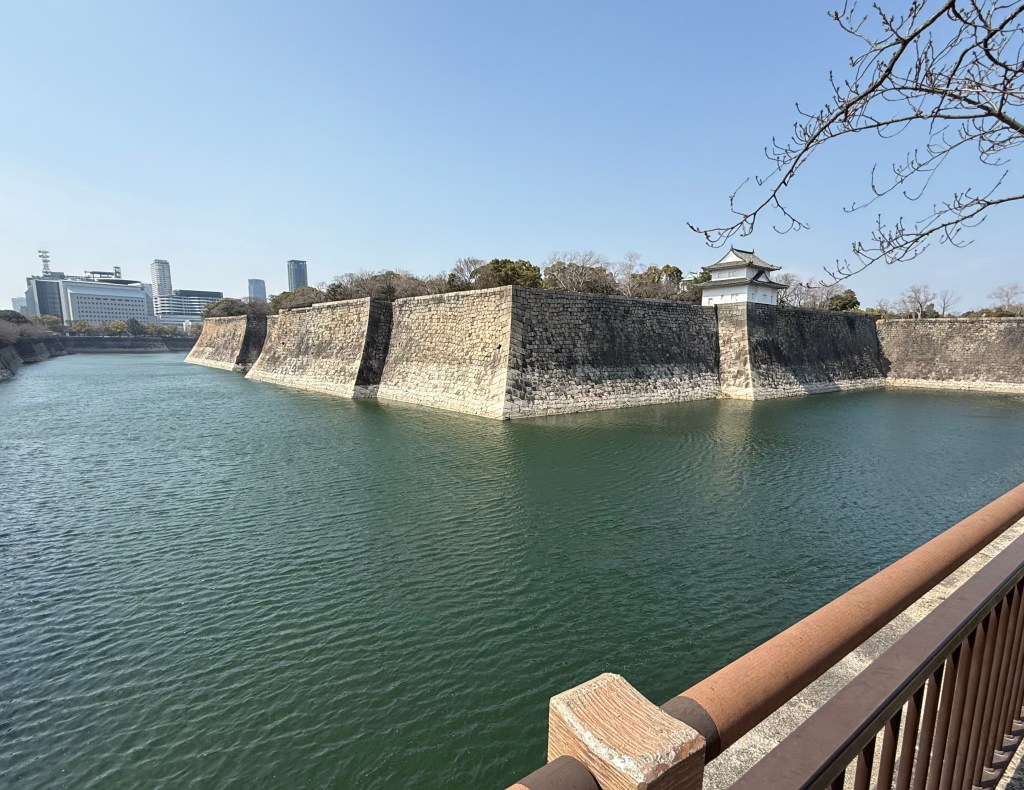 Osaka Castle is our destination, and as we arrive along with many other tourists (it is cherry blossom season – a very popular time of year to come), a guard house perched atop the edge of an enormous moat comes into view. The moat’s width and depth is astonishing, to say nothing of the stone walls holding back the water and elevating the castle grounds…and the effort it took to build these walls! Noble families at the time were required to contribute; family crests are carved into the stones. There is both an outer moat and inner moat (they really wanted to keep the marauders at bay!).