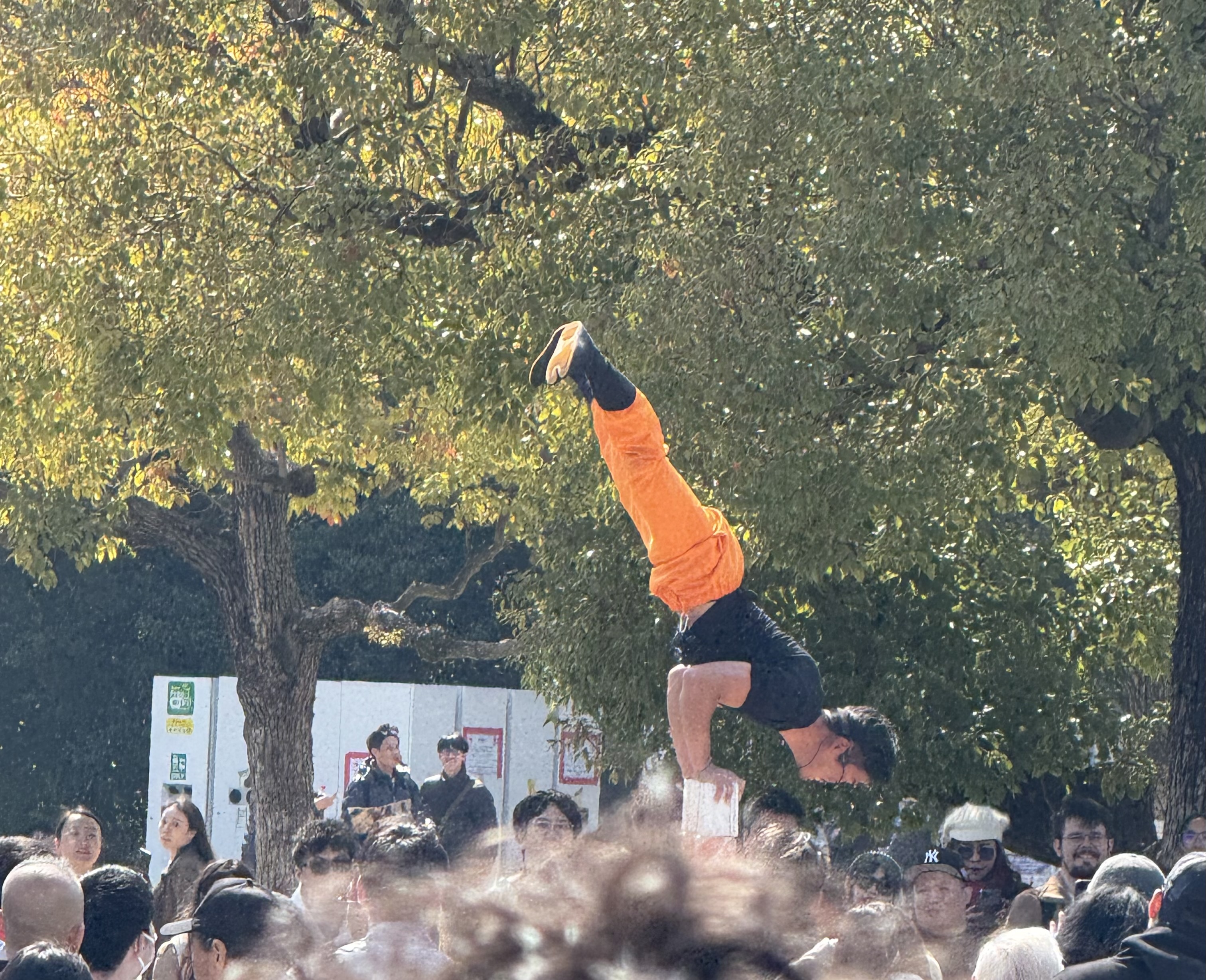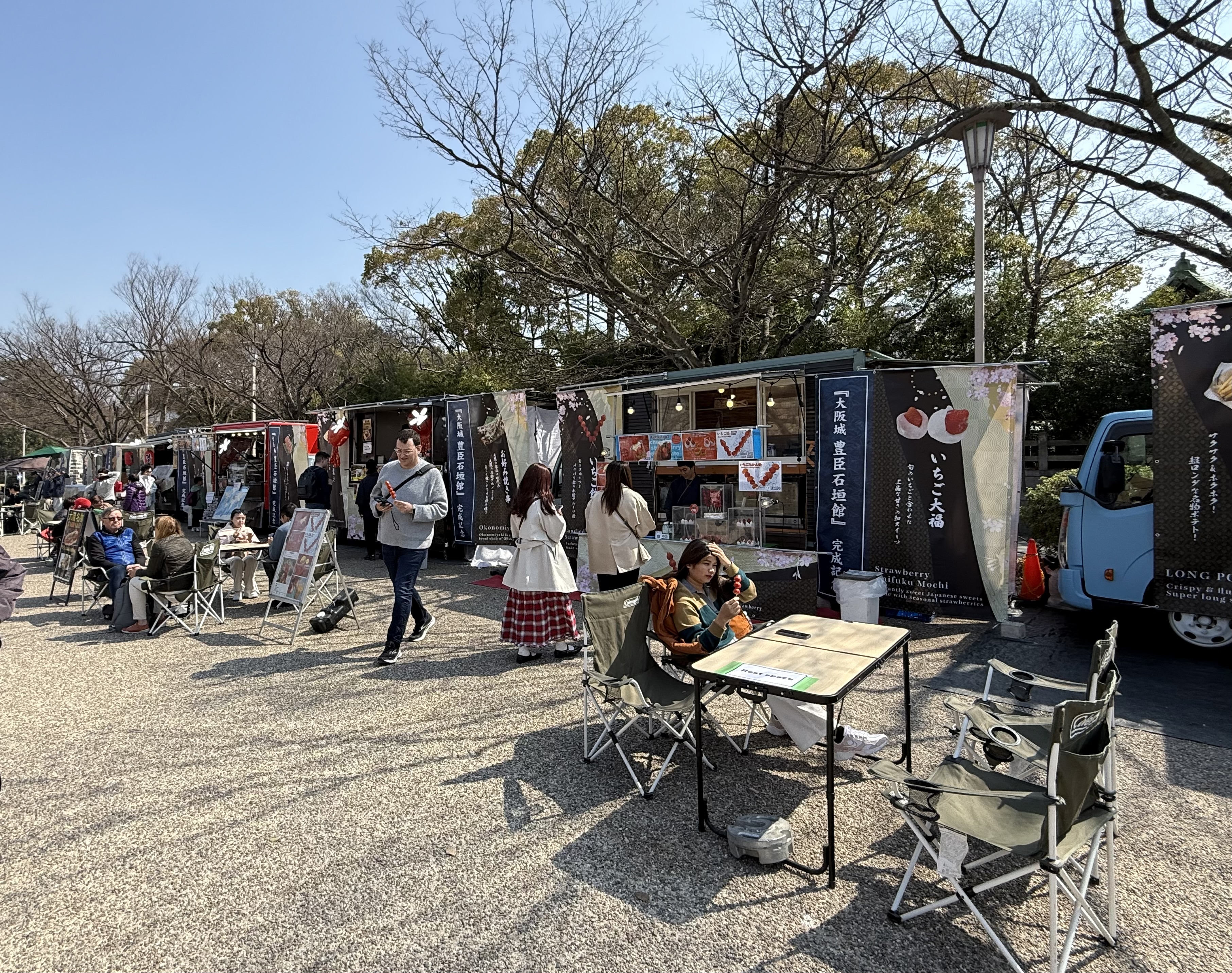 A few pics and oohs and aahs later, we make our way down and out across the castle grounds. There is a “street performer” entertaining a large crowd, and we stop for a moment before passing by vendors selling food and drink – who of course provide tables and chairs since you cannot walk and eat or drink at the same time. It’s just not done in Japan…