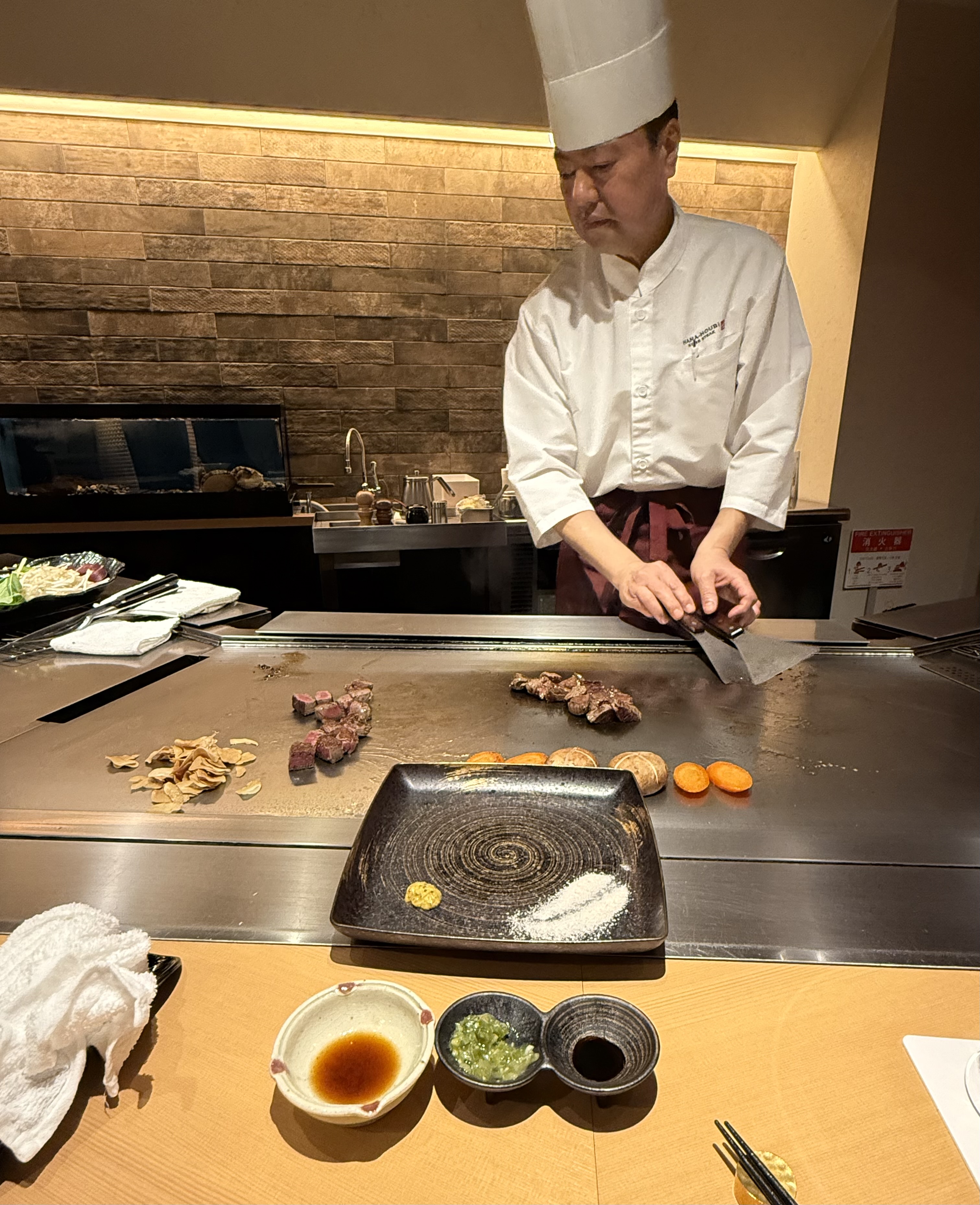 Just like in Tokyo, places are hard to find, even with the address, but the taxi driver manages to get us close enough and we look to the 2nd floor for Hana Houbi, a teppan steak house. It’s very intimate – perhaps they can fit 16 in here? The chef cooks everything perfectly, and even the veg is done just so, presented in two bite-size pieces made for chop sticks. And the beef? You’ve never had sirloin like this…