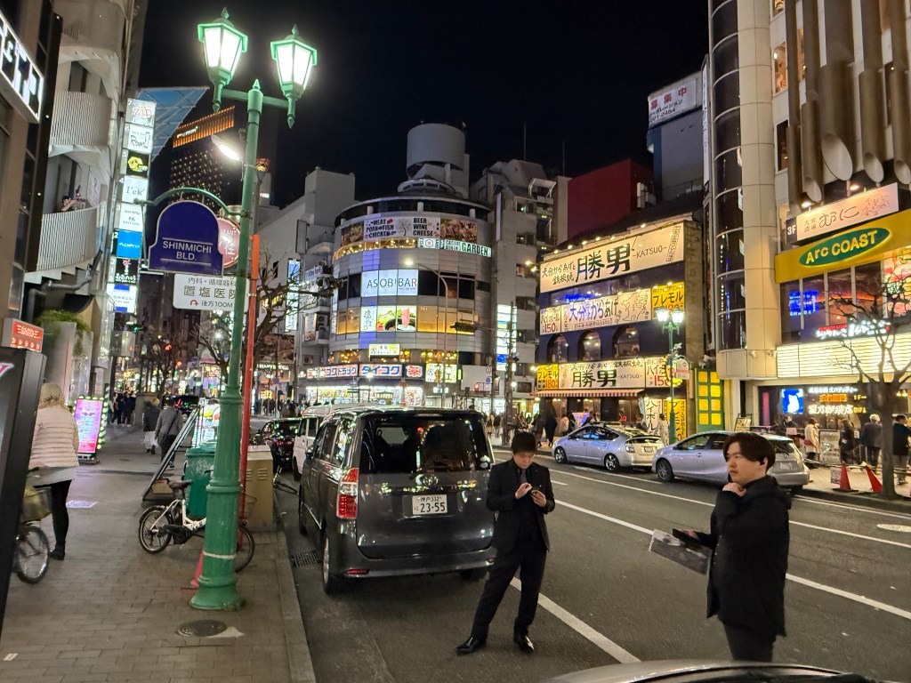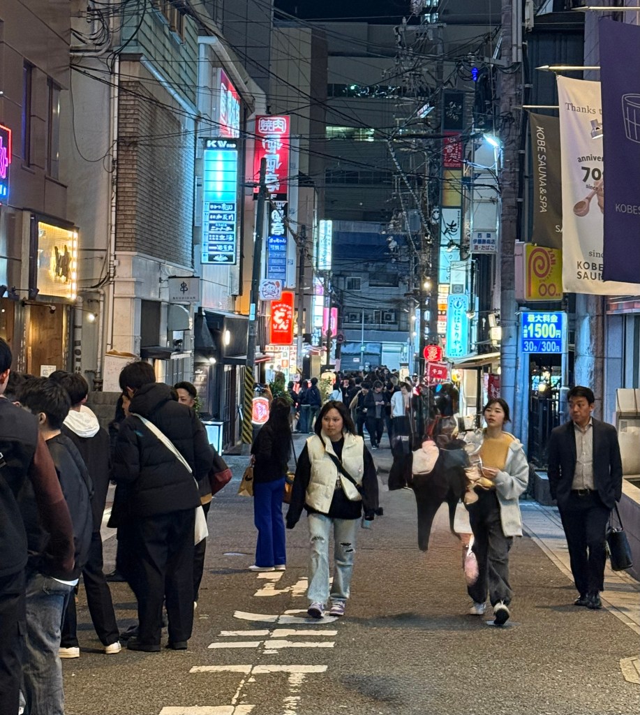 Sated with too much food and smiling from a couple glasses of sake, we emerge into Kobe at night. It’s bright and busy and the people are chatting and waiting for tables or shopping or hanging out in alleys outside of small bars. The place is alive and fascinating and a bit overwhelming. If we linger, where would we go? Which doorway would draw us in?