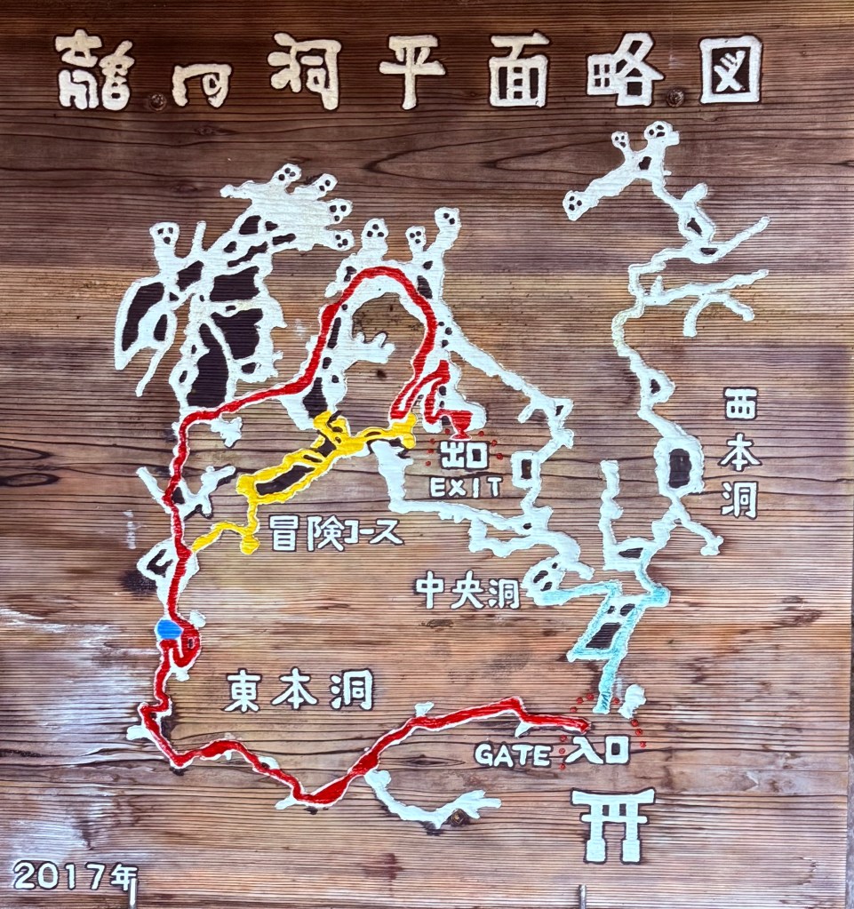 Just above the town is a chilly wet hillside and a short staircase leading to an escalator (!) dropping us at one of the cave’s entrances. Check out the map – there are a few ways to make your way through the maze of caves – we are taking the red path. One of the others requires wearing hard hats and I secretly wish we were doing that one in spite of its potential difficulty.